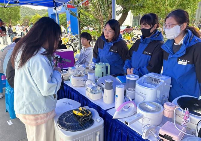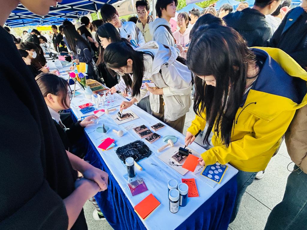 多元活动精彩纷呈,社区文化活力尽显。思政文化区开展了青马知识竞赛,以及掐丝珐琅、投壶、剪纸等非遗项目体验,让学生在巩固理论知识的同时增强了文化自信; 美育区提供植物拓印等创作体验,引导学生在自然之美中陶冶情操,激发创意灵感;科创区设有智能机器人等互动项目,为学生打开了通往前沿科技的大门,点燃了探索热情。