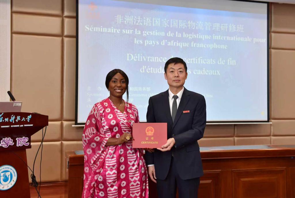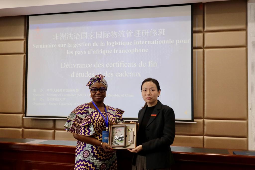 来自刚果(金)的研修班学员代表NTAMBWE BADIBANGA ADO表示,将认真学习中国在国际物流管理等方面的经验,促使本国物流行业不断发展。孙士俊为学员颁发结业证书,以及学员回赠纪念礼品。