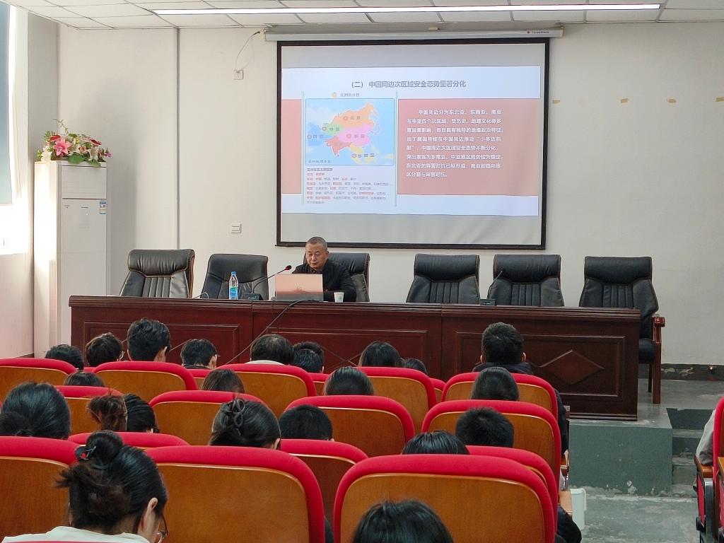 李勇从新时代中国周边工作新成就、中国周边工作面临的新形势和努力开创周边工作新局面三个方面,回顾我国近年来外交成就,分析了国际形势变化;立足国家外交策略方针,解读了党中央面对“百年未有之大变局”的战略判断与部署。他运用鲜活案例,引导学生深刻认识中国构建人类命运共同体的崇高责任与战略意义,勉励学生们增强忧患意识、坚持底线思维,发扬斗争精神、增强斗争本领,以理性和智慧直面困难,展现新时代青年的担当与作为。