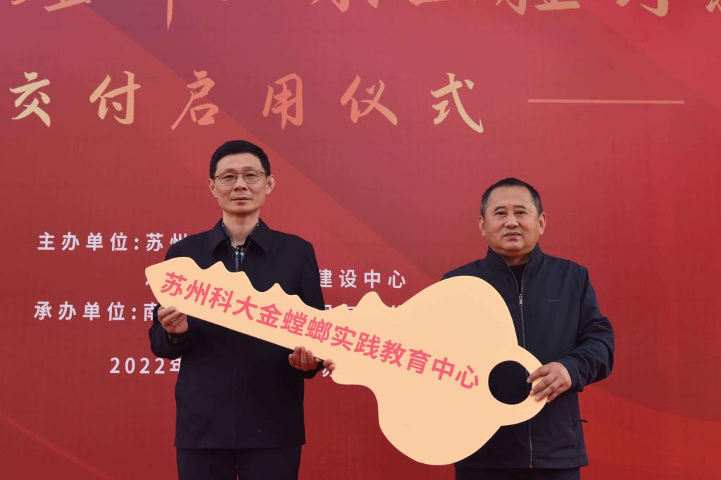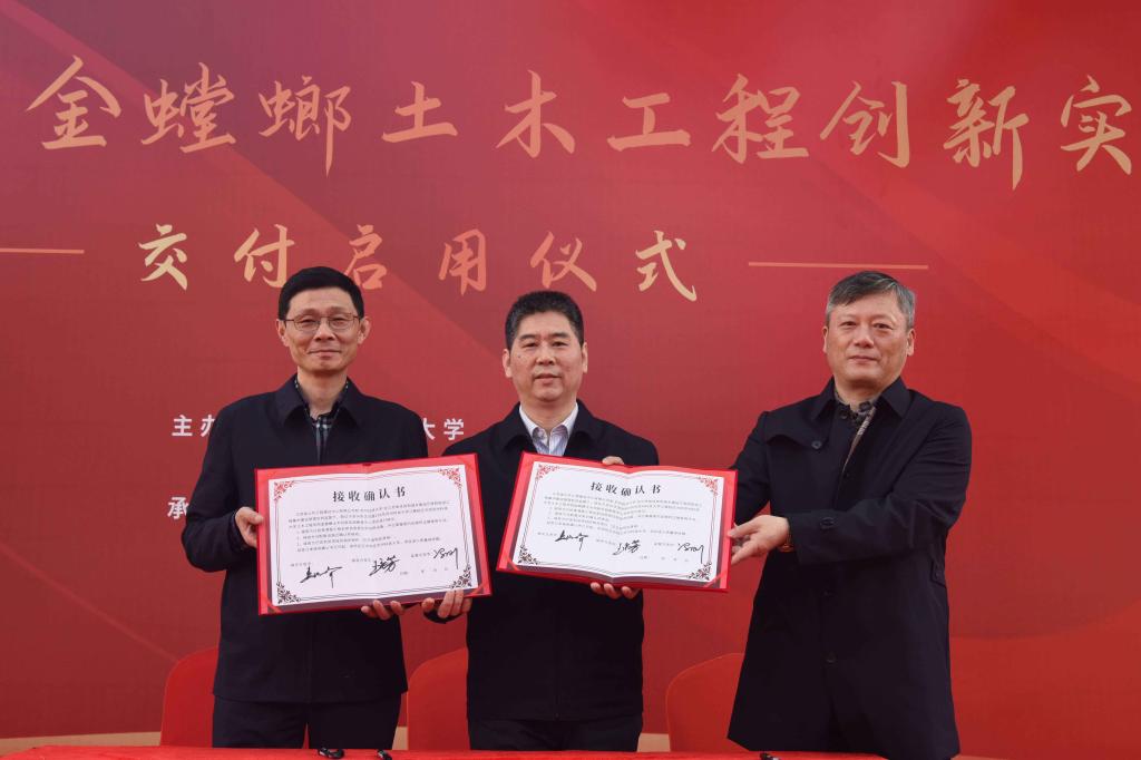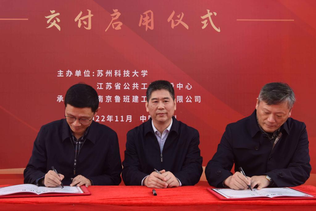仪式上,娄永峰与我校基建处处长王永芳签署《项目交接表》,并将象征交付启用的“金钥匙”交给我校资产与后勤管理处处长关江南。全体嘉宾共同展开卷轴,完成交付启用仪式。