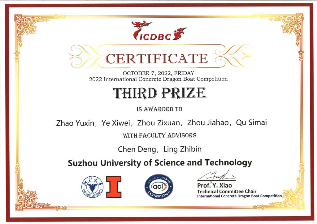近日,第四届国际大学生混凝土龙舟邀请赛(ICDBC 2022)于线上举行。经过激烈角逐,我校土木工程学院刘国建、蔡新江老师指导,姜宇翔、徐鸿雁、宋易顺、刘嘉慧、张嘉南等5名学生设计制作的“鏊雪号”龙舟荣获二等奖;陈登、凌志彬老师指导,赵雨欣、叶锡威、周子璇、周佳浩、瞿思劢等5名学生设计制作的“纵海号”龙舟荣获三等奖、技术创新奖。