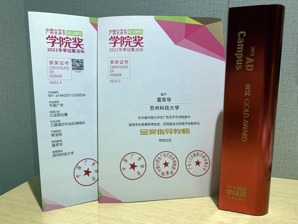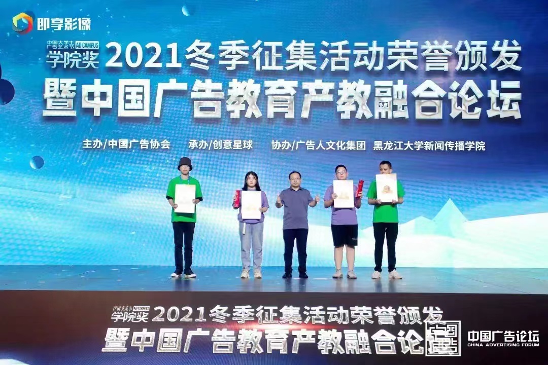 近日,中国大学生广告艺术节学院奖2021冬季征集活动荣誉颁发典礼举行。我校共有33件作品获奖,其中,金奖1项,铜奖1项,优秀奖14项,入围奖17项。莫军华老师获得“金奖指导教师”称号。
