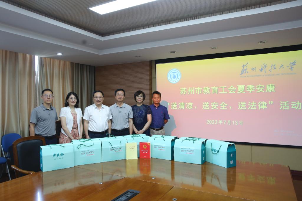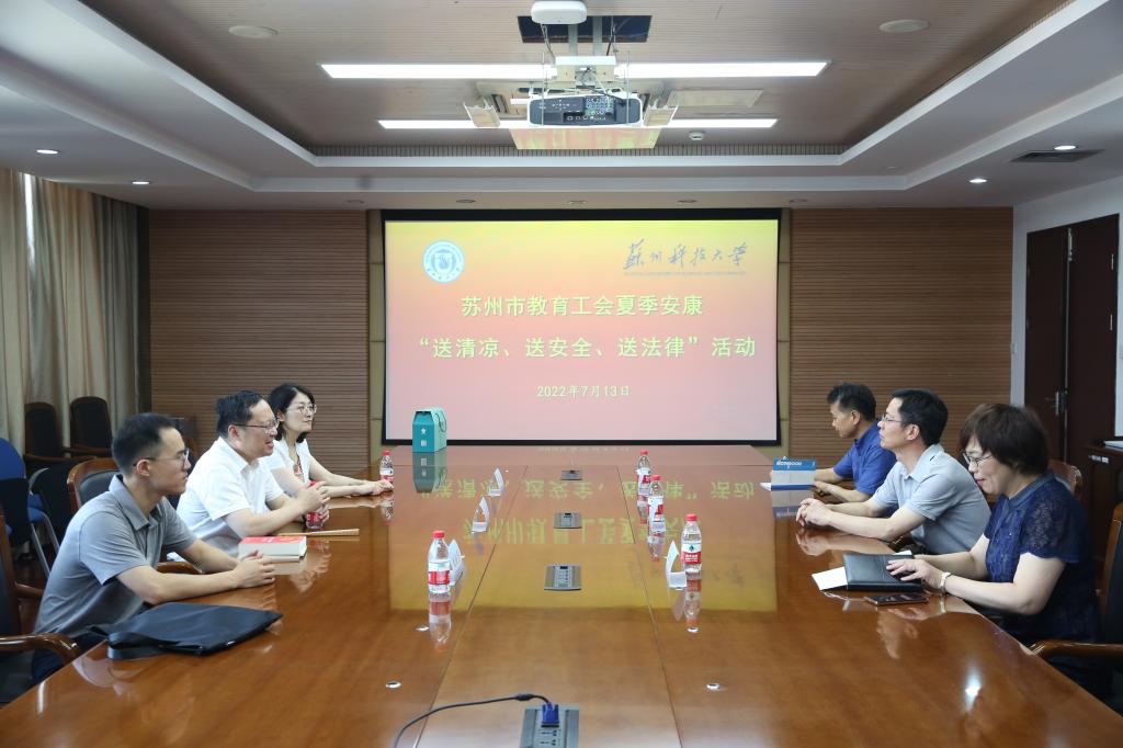 7月13日上午,苏州市教育工会主席沈宇一行来我校开展“送清凉、送安全、送法律”走访慰问活动。校党委副书记王荣庆、相关职能部门负责人在行政楼四楼会议室接待了来访。