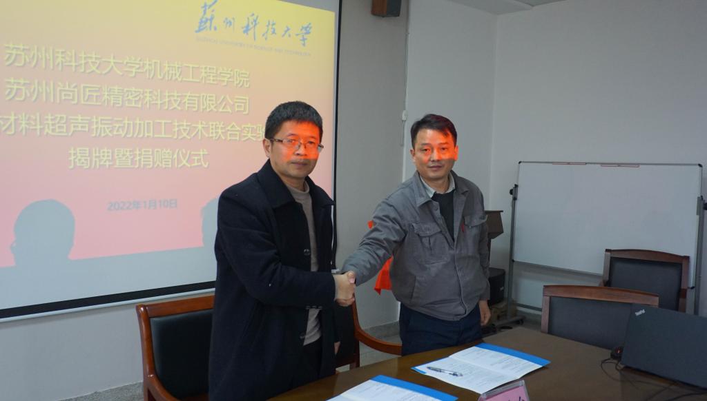 1月10日,我校与苏州尚匠精密科技有限公司共建“硬脆材料超声振动加工技术联合实验室”捐赠暨揭牌仪式在机械工程学院会议室举行。副校长施琴芬、苏州尚匠精密科技有限公司总经理苏红波、副总经理王家高、机械工程学院党政领导和教师代表参加了捐赠暨揭牌仪式,仪式由机械学院党委书记毛永宏主持。