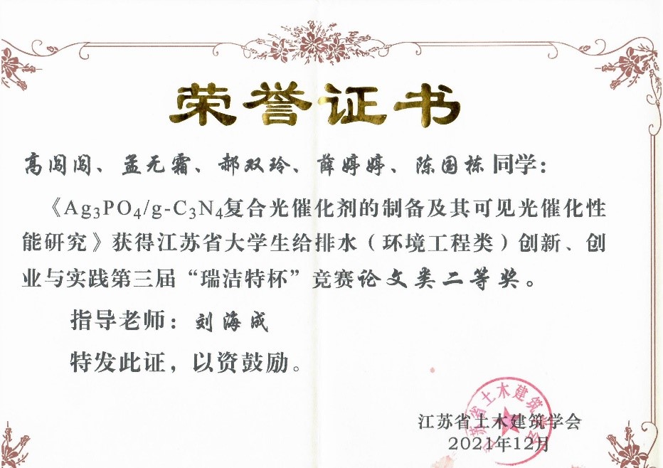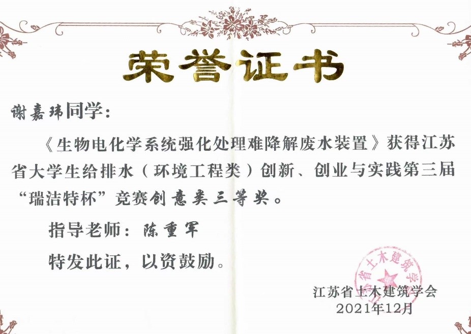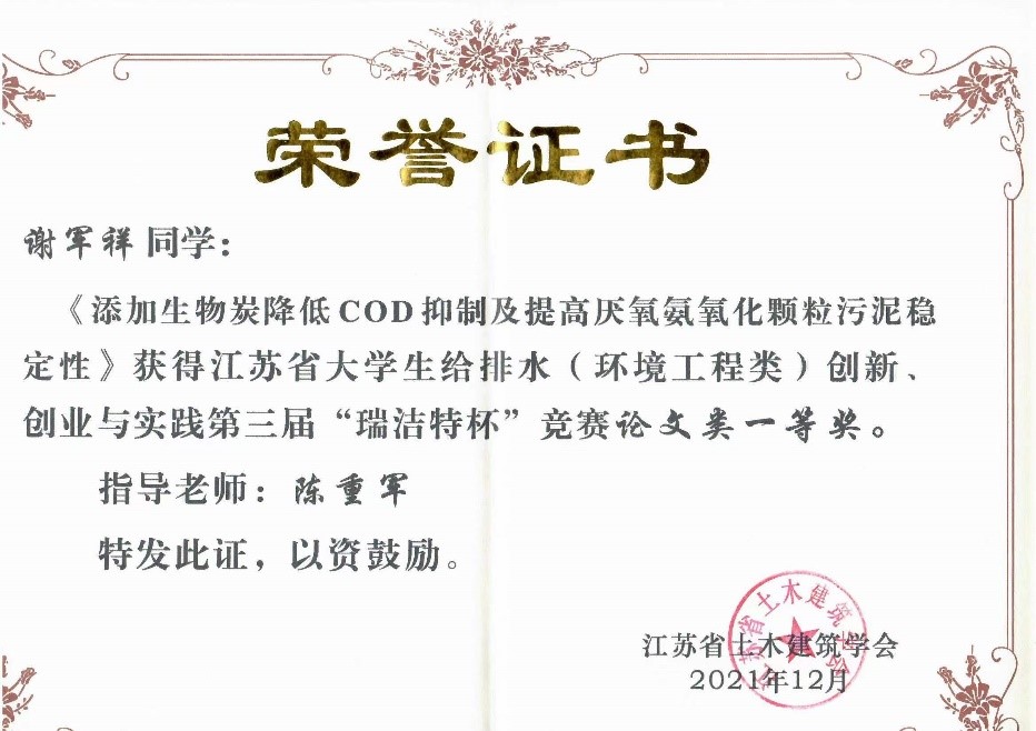 近日,2021年城镇给水排水新技术交流会暨江苏省给水排水学术交流年会在扬州召开,大会公布了第三届“瑞杰特杯”江苏省大学生给水排水创新、创业与实践竞赛评审结果,我校环境科学与工程学院学子荣获论文类一等奖1项、二等奖1项和创意类三等奖1项。