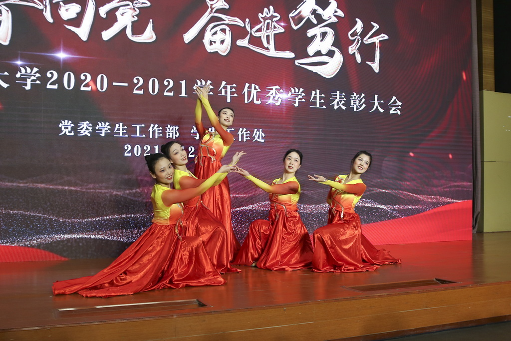此次表彰大会的串场节目精彩纷呈,校大学生艺术团带来的舞蹈表演《灯火里的中国》表现了对伟大祖国的热爱和作为中华儿女的无比自豪。辅导员合唱团带来的歌曲《青春》回顾了中国共产党的百年历程,表达了“赓续红色血脉,传承建党精神”的坚定信念。