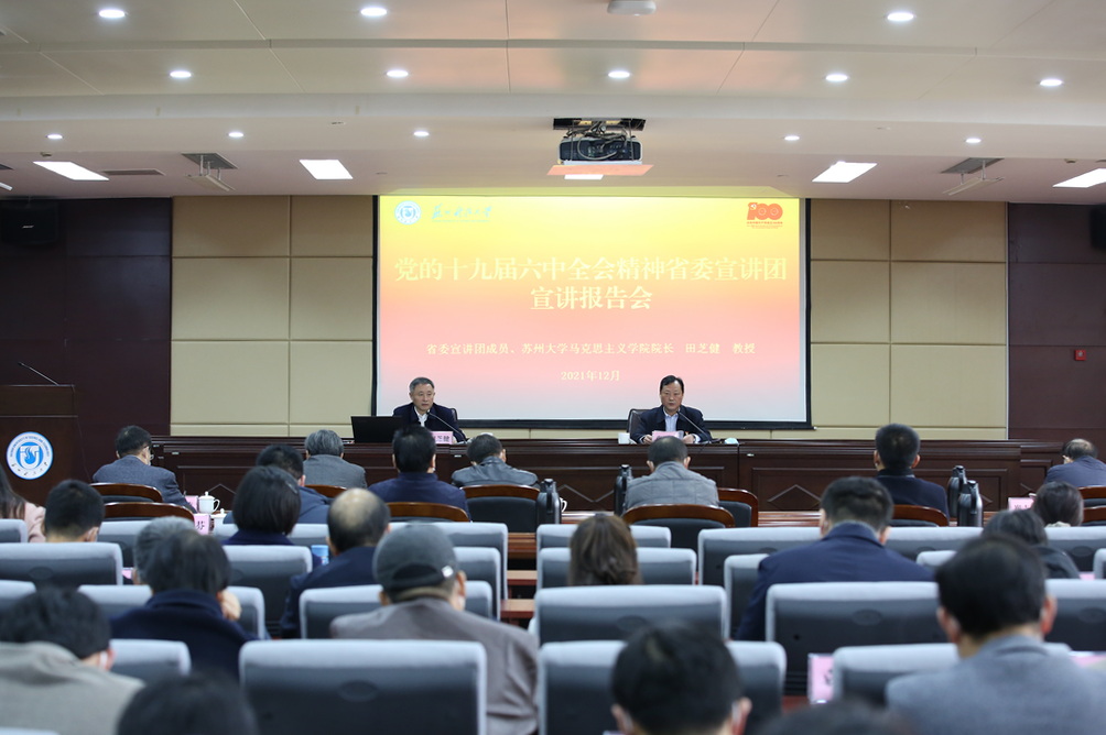 12月8日上午,我校在行政楼一楼报告厅召开学习贯彻党的十九届六中全会精神省委宣讲团报告会。报告会由省委宣讲团成员、苏州大学马克思主义学院院长田芝健教授主讲。校领导,校党委理论学习中心组全体成员,全校中层干部,市级以上党代表、人大代表、政协委员,各民主党派负责人,教师、辅导员和学生代表等参加报告会。报告会由校党委书记张庆奎主持。