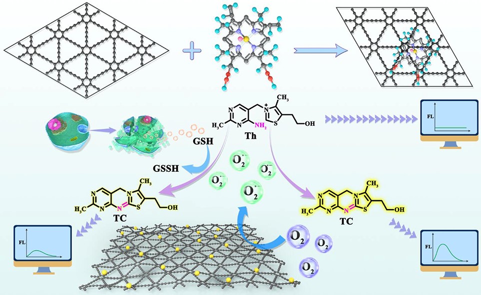 该研究成果设计了一种独特的模拟氧化酶的催化剂,由石墨炔上自组装氯化血红素分子组成(Hemin/GDY),单分子分布的Hemin分子均匀的固定在GDY的碳框架上,铁原子平均粒径为1.3 Å,接近单原子铁的尺寸,所以该材料催化性能显著提高,可在宽pH范围内(pH值从2到12范围内)高效生成超氧阴离子。利用该材料建立了对细胞裂解液中谷胱甘肽(GSH)的高选择性高灵敏度检测方法,检测限在0.7 nM。这种氧化酶模拟催化剂不仅在建立生物学还原性小分子和疾病检测与治疗方面有很大的前景,也为石墨炔的单原子自组装的设计和制备开辟了新的前景。