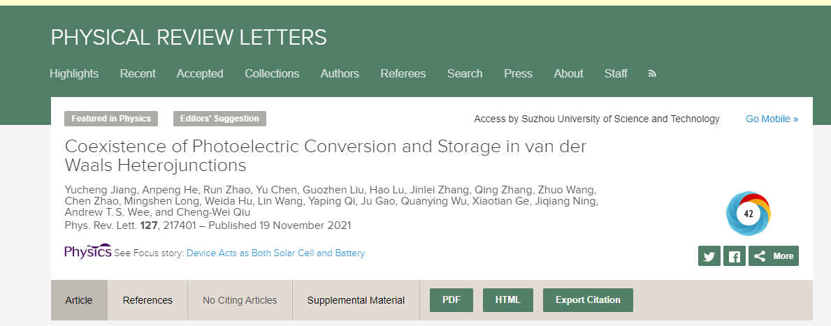 论文入选亮点文章在期刊网站发布,美国物理学会以Device Acts as Both Solar Cell and Battery为题进行了重点报道,称赞该研究首次在单一范德华异质结中同时实现了光电的转化和存储。