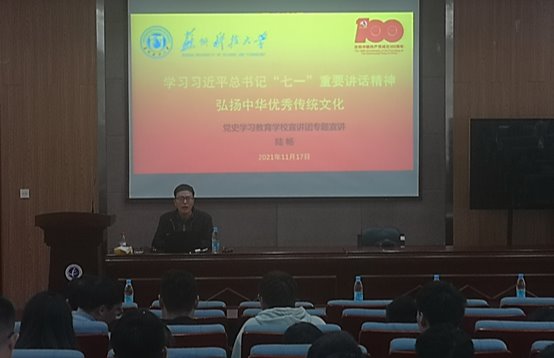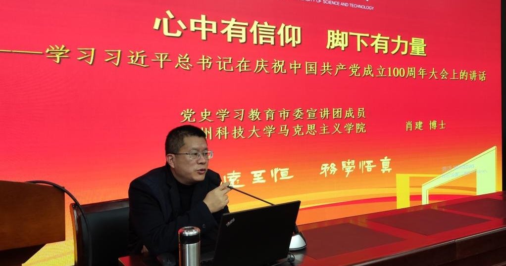 马克思主义学院党委副书记兼副院长肖建为离退休党工委、环境科学与工程学院党委作《心中有信仰,脚下有力量——学习习近平总书记在庆祝中国共产党成立100周年大会上的重要讲话精神》的专题报告。他结合中国共产党波澜壮阔的成长史、荡气回肠的革命史、不屈不挠的斗争史,阐述了如何准确把握党的历史发展的主题主线、主流本质,科学评价党史上的重大事件、重要会议、重要人物。