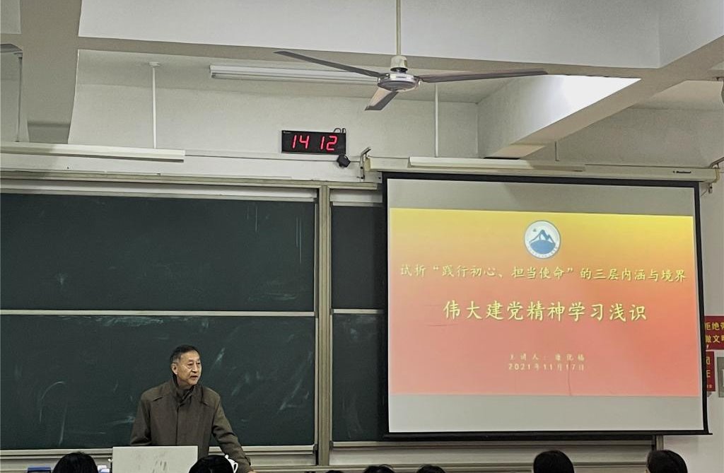 离退休党工委委员康化椿副教授为地理科学与测绘工程学院全体教师党员和学生党员作题为《“践行初心、担当使命”的三层内涵与境界——伟大建党精神学习浅识》的报告。他从“构建人类命运共同体”的角度,生动讲述了中国共产党为中国人民谋幸福、为中华民族谋复兴的初心使命。