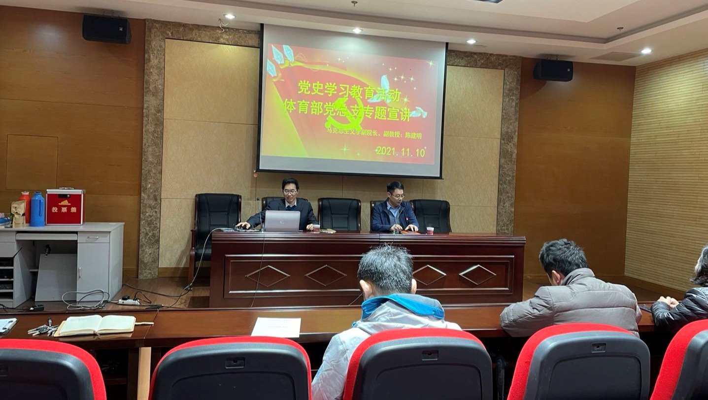 马克思主义学院副院长陈建明为体育部党总支作题为《涅槃奋进一百年 同心筑梦新时代》的宣讲。陈建明从新民主主义革命、社会主义革命和建设、改革开放和社会主义现代化建设、新时代中国特色社会主义建设四个方面,阐述了中国共产党百年奋斗取得的四个伟大成就。