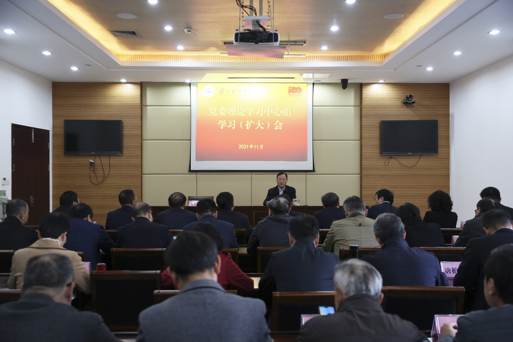 11月18日下午,学校在行政楼一楼视频会议室召开党委理论学习中心组专题学习(扩大)会,结合党史学习教育,深入学习贯彻党的十九届六中全会精神,学习贯彻《中国共产党普通高等学校基层组织工作条例》(以下简称《条例》),围绕“学党史、开新局”开展研讨。校党委理论学习中心组成员、各二级党组织书记参加会议,会议由校党委书记张庆奎主持。