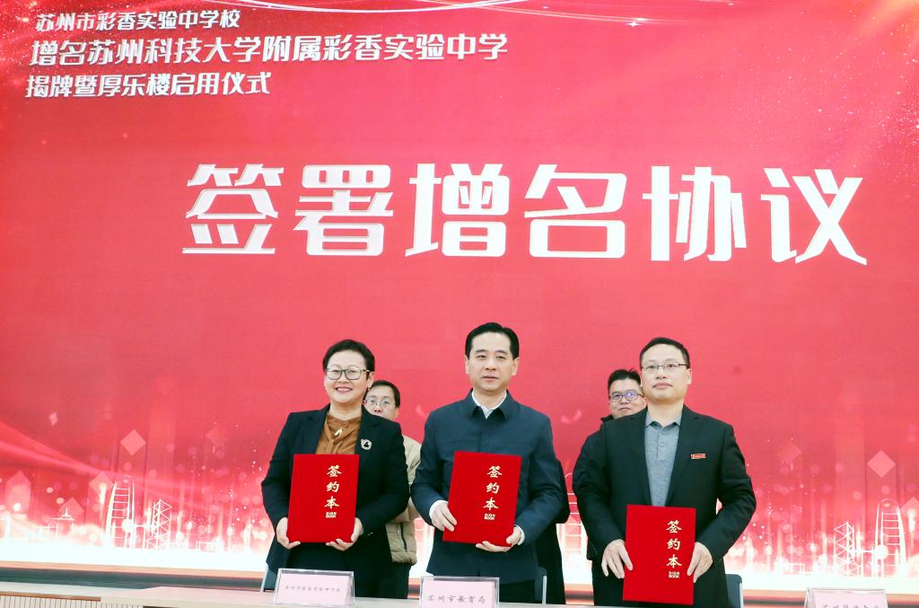 吴健荣宣读了学校关于同意苏州市彩香实验中学校增名为“苏州科技大学附属彩香实验中学”的决定。张庆奎、曹后灵、马九根、周志芳共同为苏州科技大学附属彩香实验中学揭牌。发展规划处处长叶金平、苏州教育局副局长朱向峰、苏州市彩香实验中学校长邹全红共同签署增名协议。
