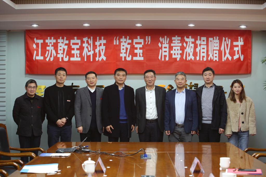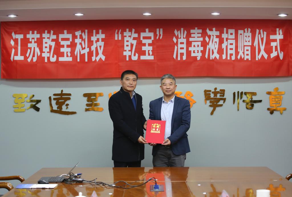 王翼宁与丘东先后介绍了江苏乾宝科技发展集团的基本情况和“乾宝”消毒液的研发过程,对消毒液、消毒物品的安全性、环保性作了说明,表示公司将一如既往地尽企业所能与社会各界携手合作,共同打赢这场疫情防控阻击战和攻坚战。