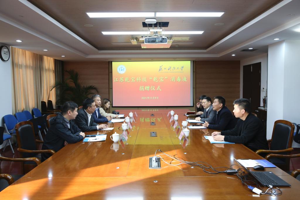 近日,江苏乾宝生物科技有限公司“乾宝”消毒液捐赠仪式在行政楼四楼会议室举行。江苏乾宝科技发展集团总裁王翼宁、江苏乾宝生物科技有限公司总经理丘东,我校副校长张新亚,校长办公室、资产与后勤管理处、后勤服务总公司等部门负责人参加捐赠仪式。仪式由校长办公室主任朱明珠主持。
