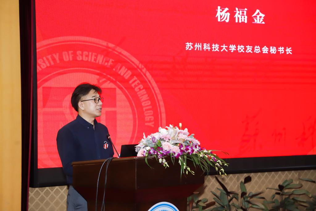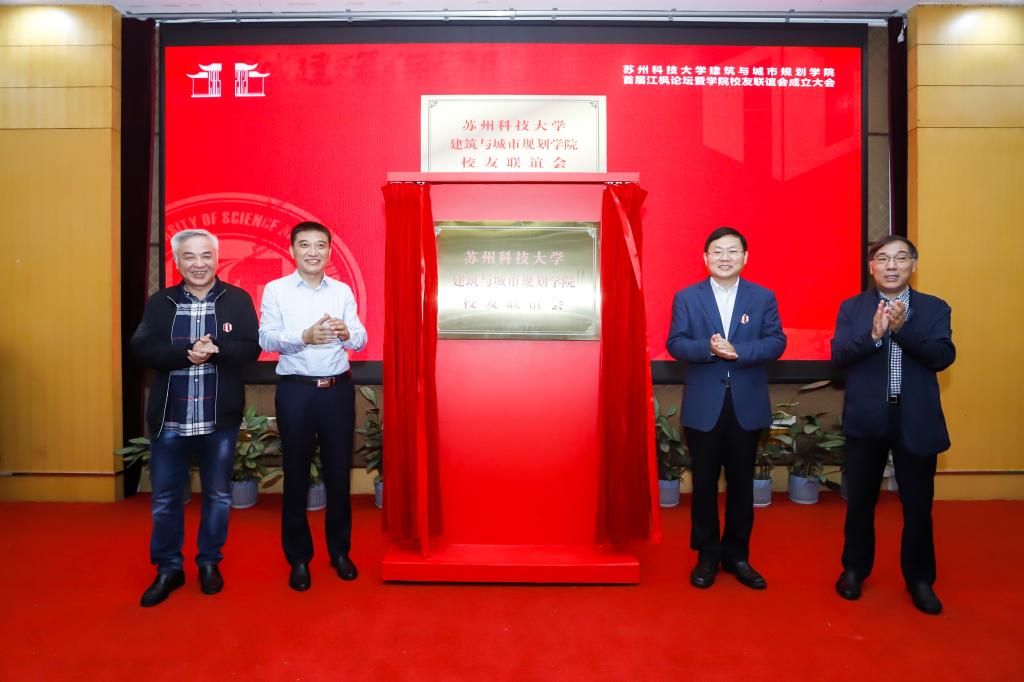 张新亚、杨新海、夏健和学院杰出校友、江苏规划设计集团有限公司总经理梅耀林共同为校友联谊会揭牌。校友总会秘书长杨福金,原建筑系党总支书记张君年,学校校友总会副会长、苏州校友会会长杨辉(风景园林专业86级校友)分别致辞。