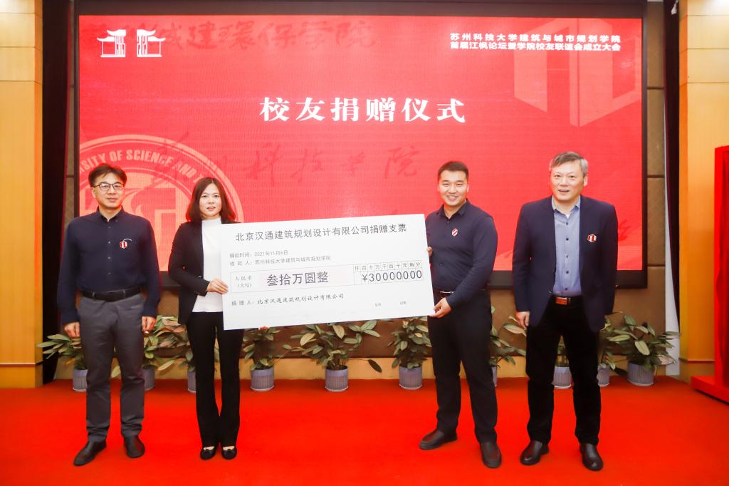 会上,建筑学专业96级校友、北京汉通建筑规划设计有限公司董事长万强向学院捐赠30万元,用于支持学院教育事业的发展。李敏代表学院接受了企业代表李春辉校友的捐赠。