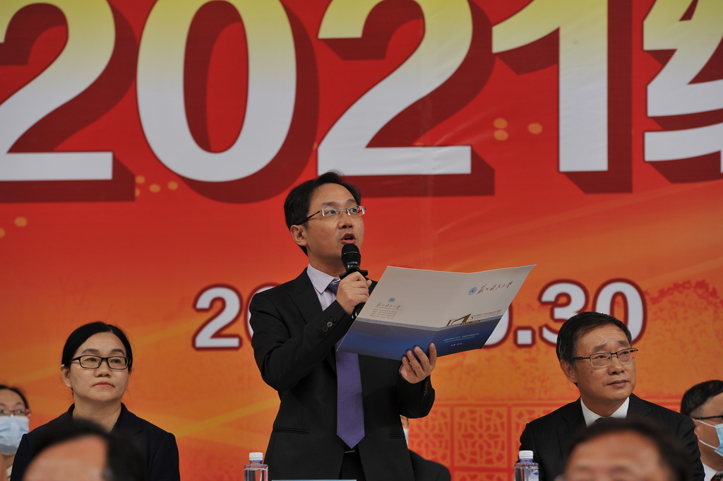 伴随着雄壮激昂的国歌声,2021级新生开学典礼拉开帷幕。今年,开学典礼分本科生和研究生两场举行,分别由校党委副书记王荣庆和副校长吴健荣主持。