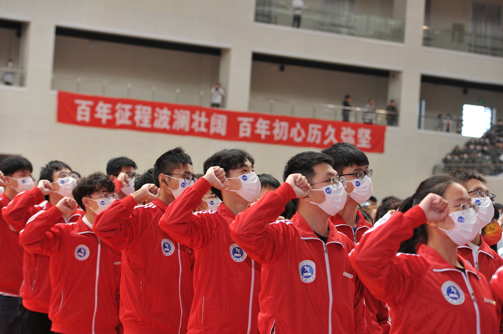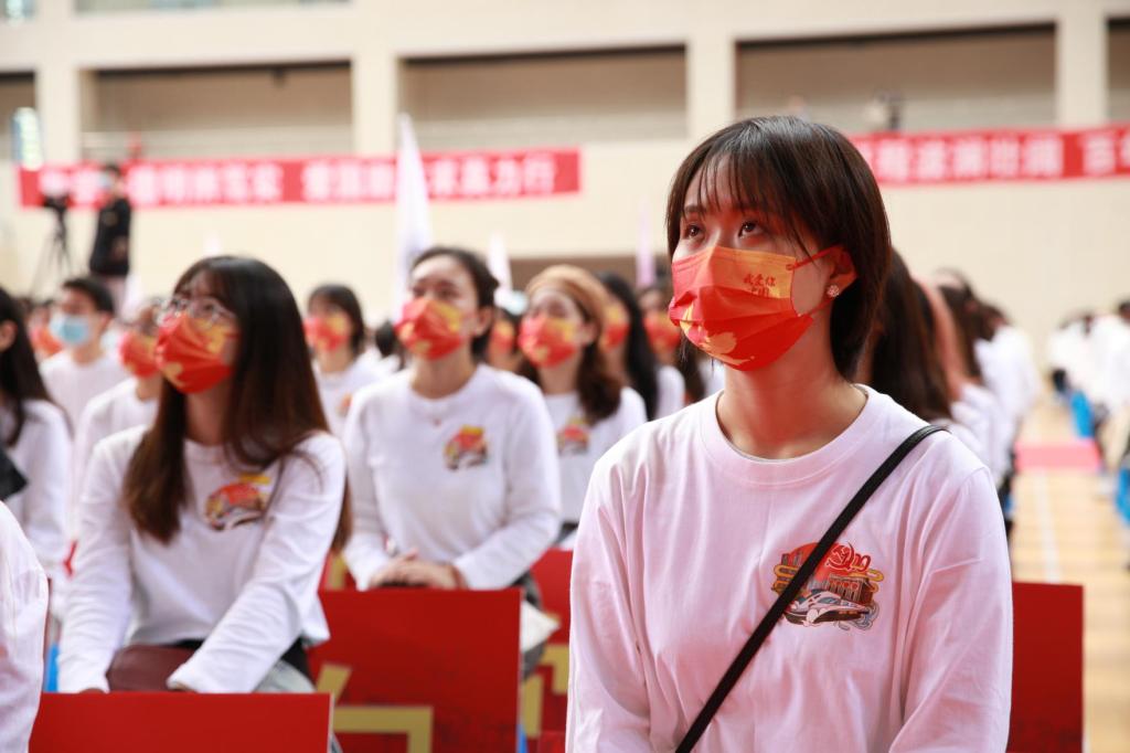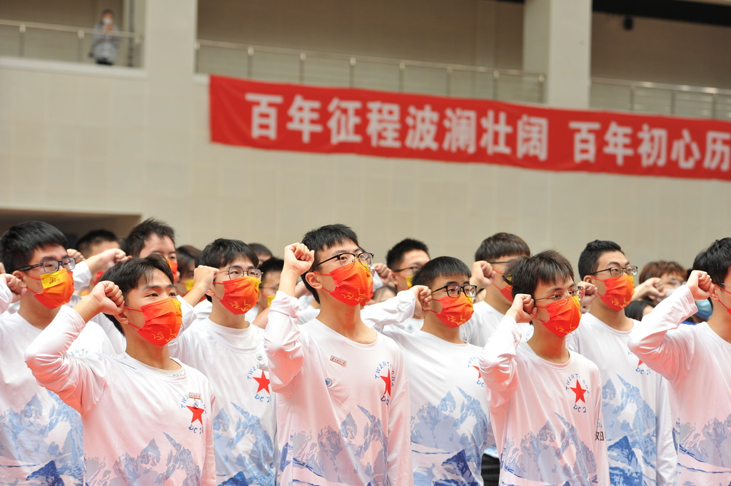 在教育学院顾婉倩同学的领誓下,新生们右手握拳,许下铿锵有力的青春誓言。