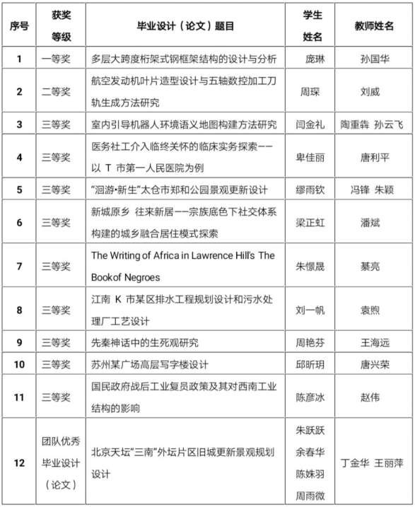 土木工程学院土木工程专业庞琳的毕业设计《多层大跨度桁架式钢框架结构的设计与分享》获一等奖;机械工程学院机械设计制造及其自动化专业周琛的毕业设计《航空发动机叶片造型设计与五轴数控加工刀轨生成方法研究》获二等奖;电子与信息工程学院通讯工程专业闫金礼的毕业设计《室内引导机器人环境语义地图构建方法研究》等9项获三等奖;建筑与城市规划学院组织申报的团队毕业设计《北京天坛“三南”外坛片区旧城更新景观规划设计》获江苏省团队优秀毕业设计(论文)奖。