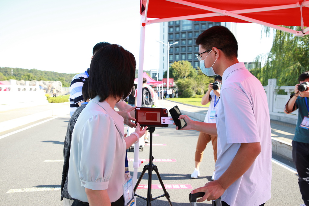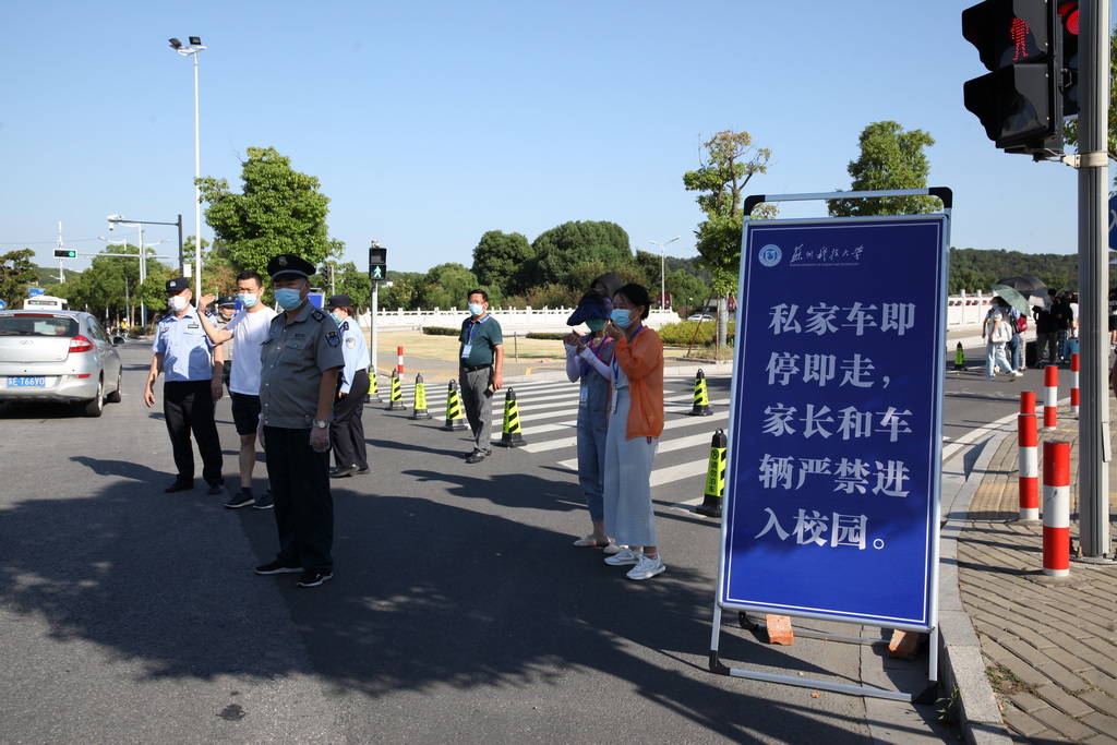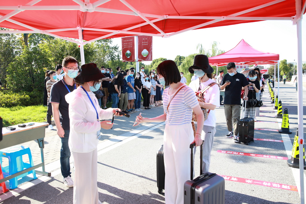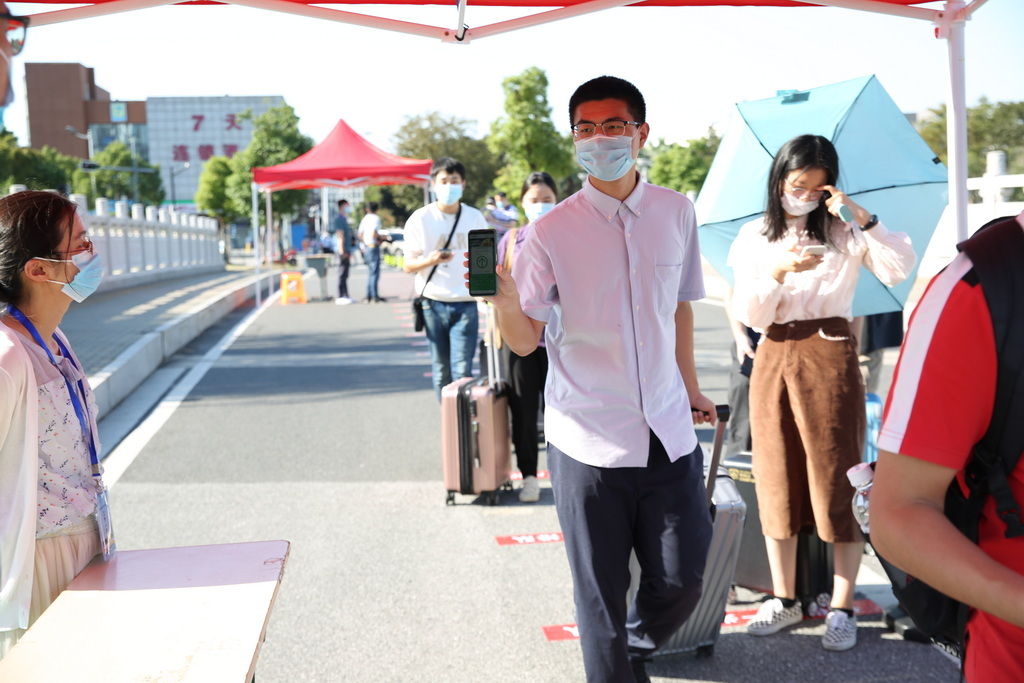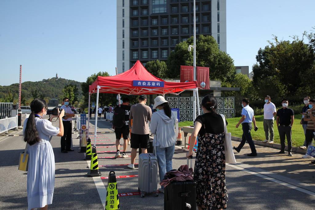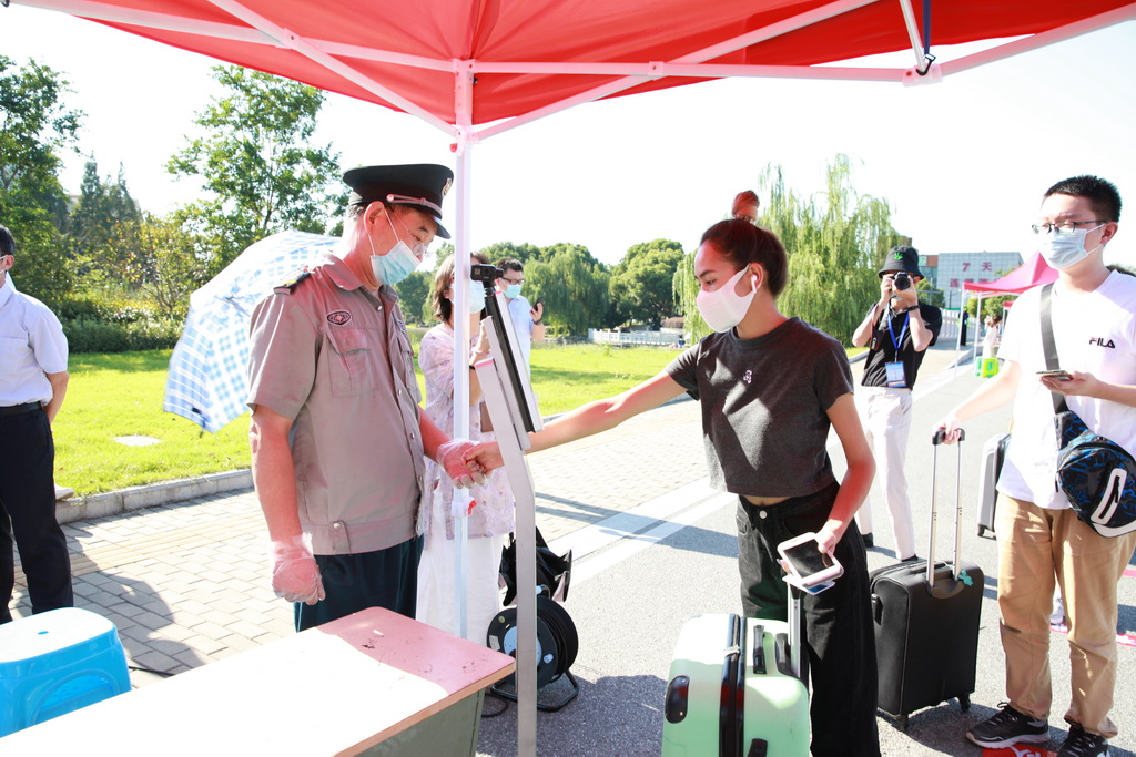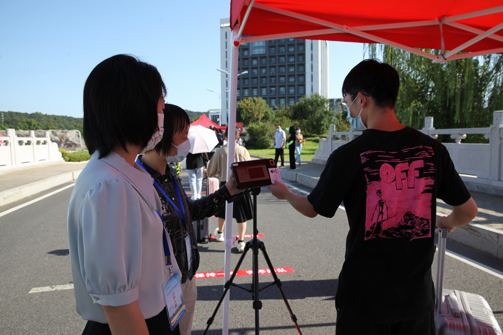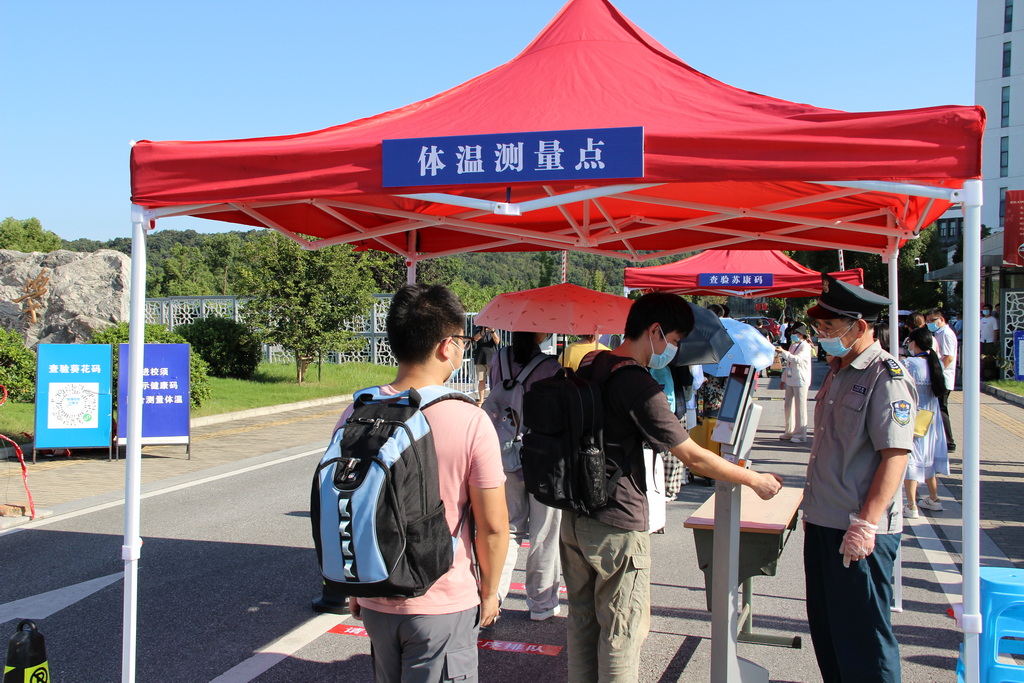 演练以现场情景模拟的方式进行。“返校学生”乘坐私家车或大巴车到达指定停靠点下车。在保卫处工作人员的指挥下,送行车辆即停即走。在校门口资格审核点,学生们佩戴好口罩,排队间隔1米,有序完成刷身份证核对身份信息、查阅“通信大数据行程卡”、测体温、查验“苏康码”等“一核二查三测四验”程序后进入校园。