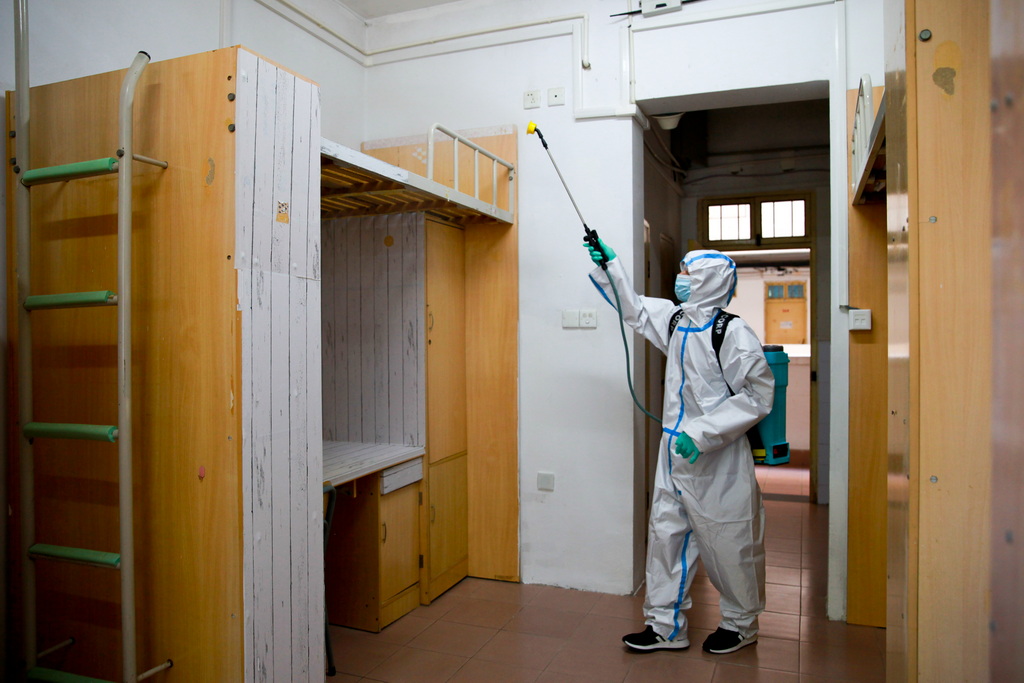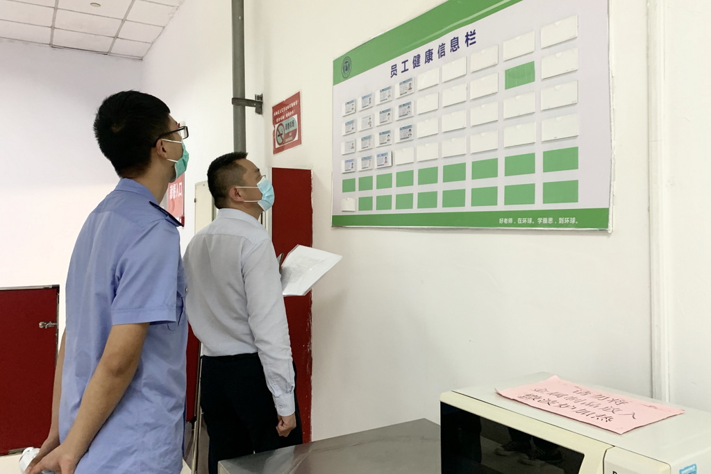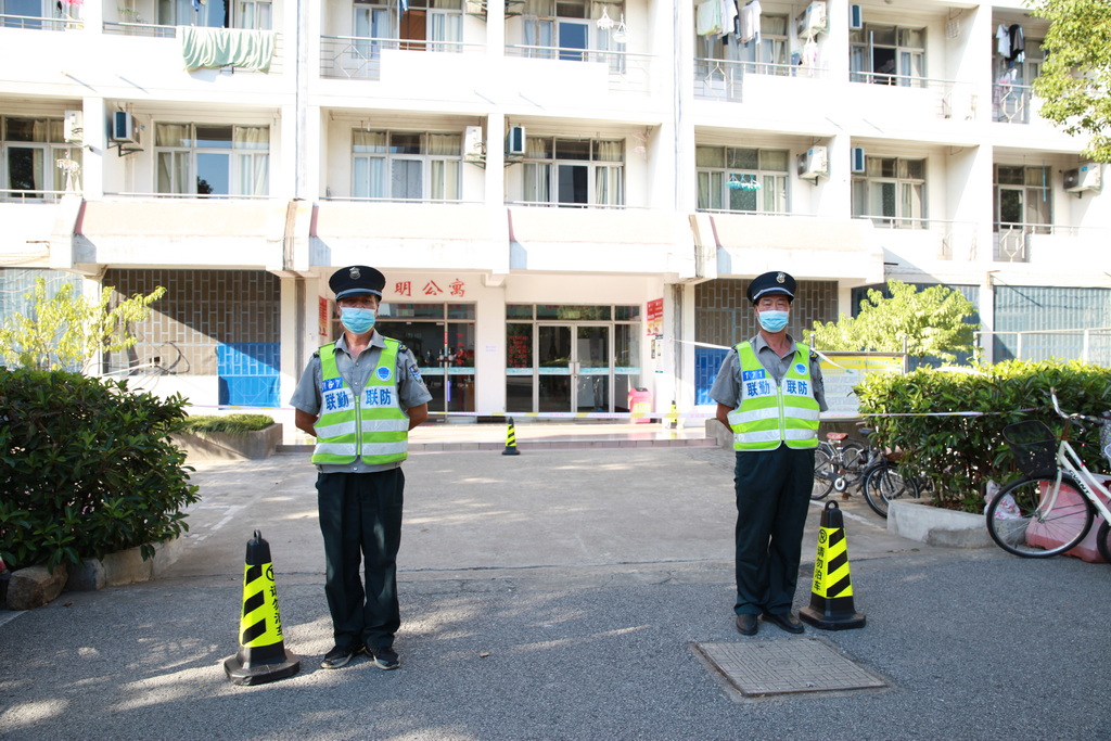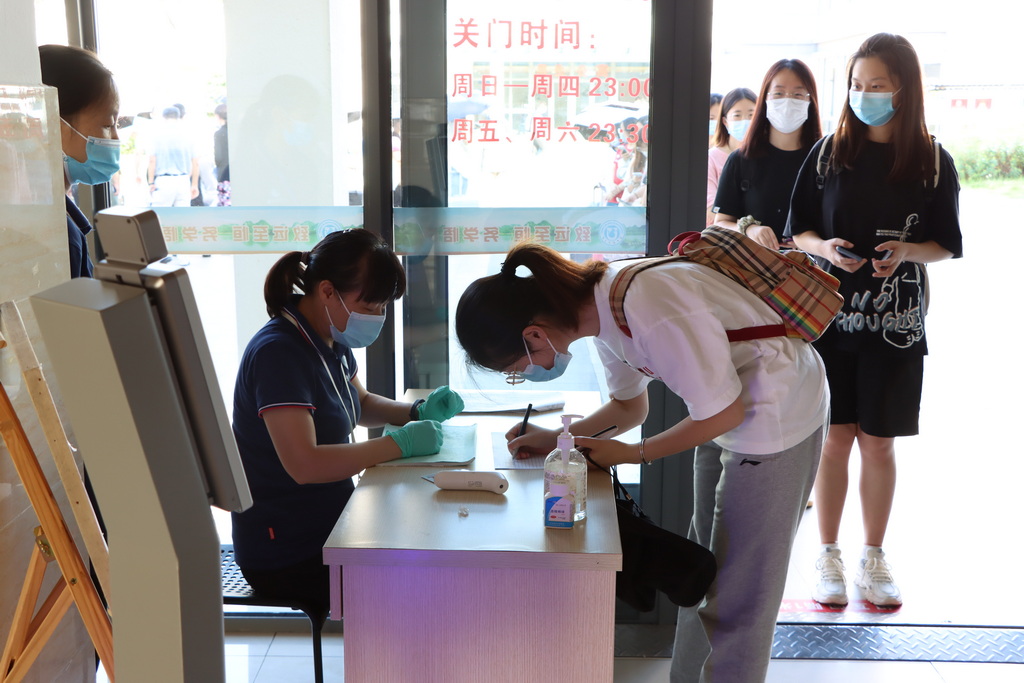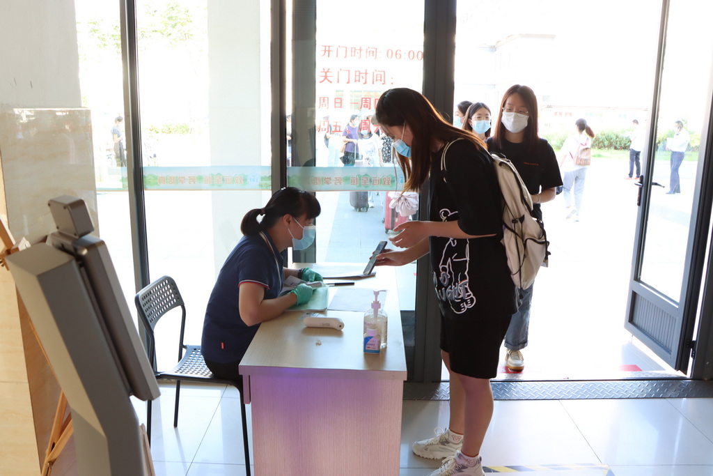 在12号楼大门口,后勤服务总公司设置身份核查点,公寓管理人员现场监督并维持秩序,并对返校学生逐一登记,对身份异常情况进行核实并处置。
