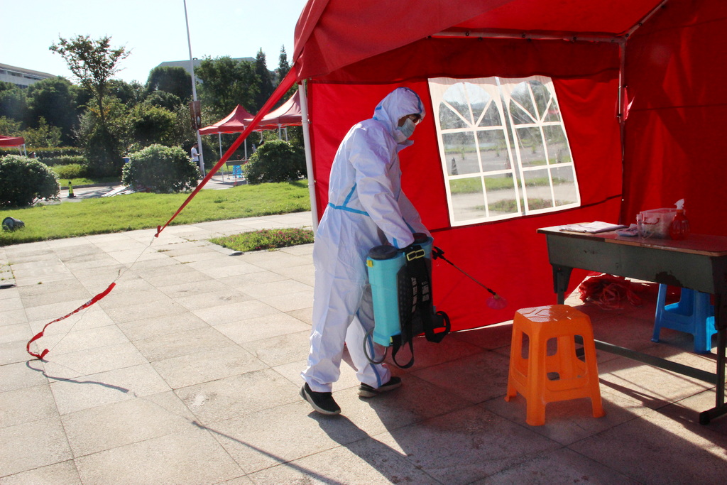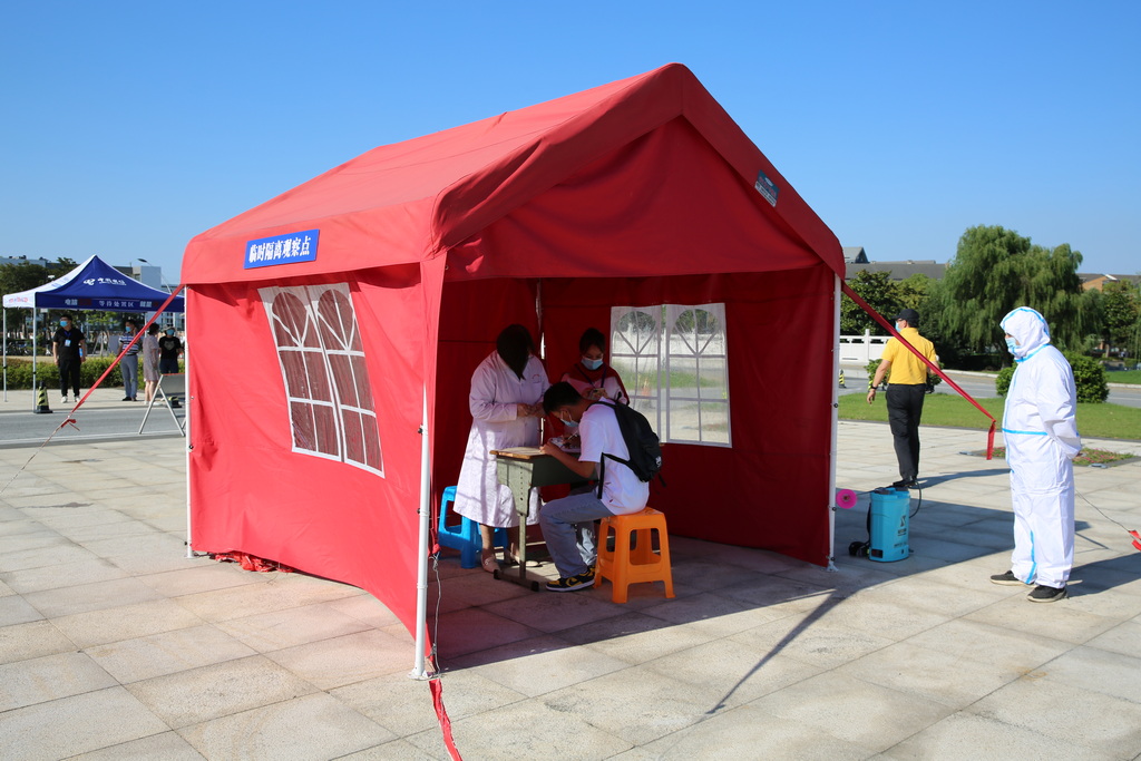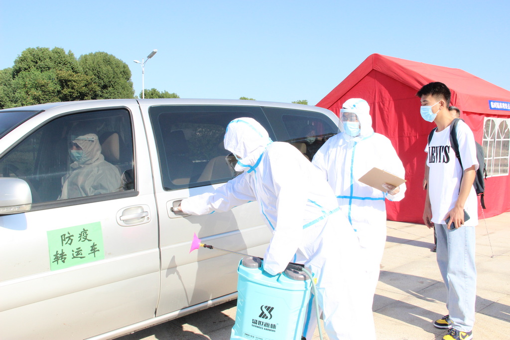 在体温检测区,一名体温超过37.3℃的学生被工作人员带至临时隔离观察点。医生迅速给他加戴医用外科口罩,进行体温复测、症状问诊并询问流行病学史,做好记录。体温复测异常并经身份核实为正常返校学生后,现场工作人员第一时间报告校医疗中心主任,并报告现场总指挥、综合协调组负责人,通知各相关部门。后勤保障及应急处置组了解了该学生的行程信息和接触史情况后,经研判确定该学生需送诊,校医院安排专车送往定点医院,并对临时隔离观察点和学生的行李箱等个人随身物品进行消杀。