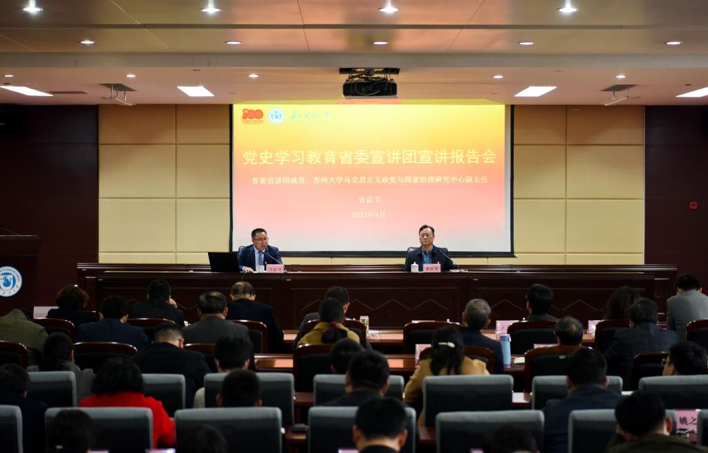4月8日下午,党史学习教育江苏省委宣讲团成员、苏州大学马克思主义政党与国家治理研究中心副主任吉启卫走进我校行政楼一楼报告厅,以《从党的百年历史中汲取智慧和力量》为题作党史专题宣讲。报告会由校党委书记张庆奎主持,全体在校校领导、党员中层干部、党史学习教育学校宣讲团成员和部分学生党员代表参加了报告会。