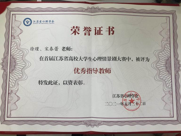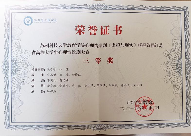 5月22日,首届江苏省高校大学生心理情景剧大赛决赛在南京师范大学举行。我校教育学院的作品《可不可以“不”》、《虚拟与现实》分别获得二等奖和三等奖,两项作品的指导老师宋春蕾、徐瑾获优秀指导教师奖。
