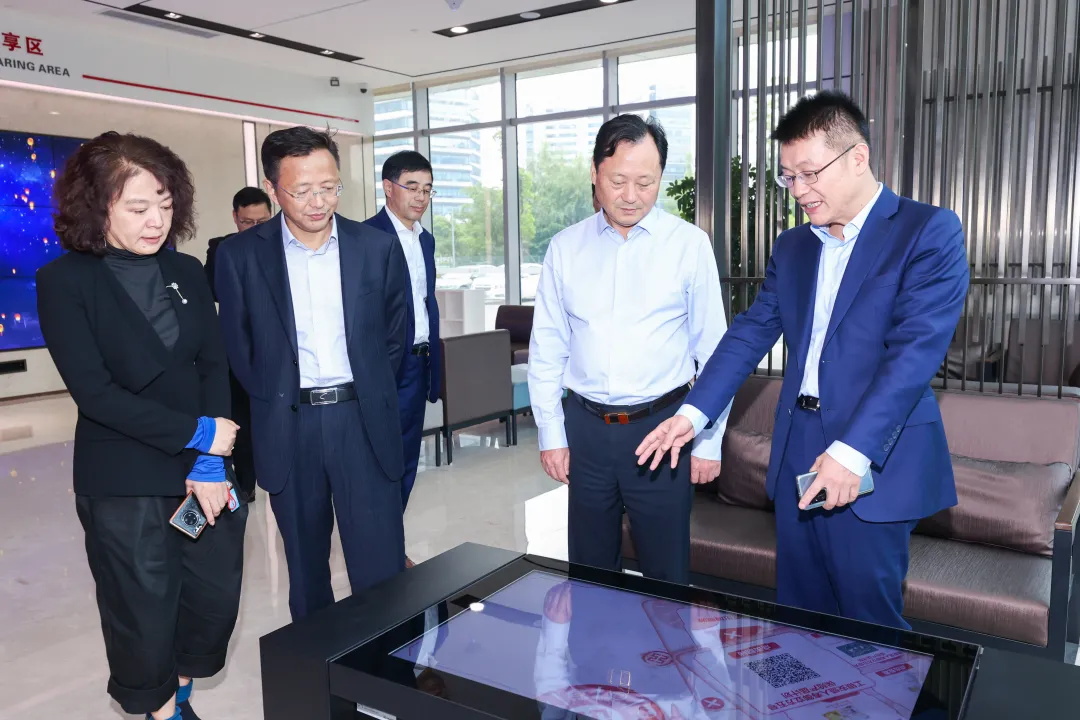 张庆奎、姜朋明一行在邱亚光的带领下,参观了工行苏州分行5G智慧网点的各个展区,领略了新时代5G网点的科技魅力。
