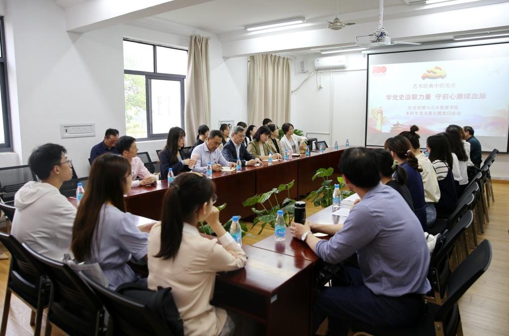 随后,指导组一行来到1教213会议室,列席了社会发展与公共管理学院本科生党支部举办的“学党史汲取力量 守初心赓续血脉”主题党日活动。学院袁成亮教授以“科技题材影片赏析——两弹一星”为主题,讲述了王淦昌、彭桓武、于敏、钱三强、钱学森、郭永怀等科学家克服重重困难,研制成功“两弹一星”的故事,激励学生们学习科学家的爱国主义精神。随后播放了《以史促培 资政育人》短视频,该视频系统回顾了学院党史学习教育阶段工作。民主党派代表、农工党苏州科技大学支部副主任委员沈骅老师从“爱国”的角度切入,分享了党史学习教育的感想,表示将弘扬爱国主义精神,为祖国繁荣富强贡献力量。研究生党史宣讲团成员张红艳分享了参加基层宣讲的体会,历史专业党员陈心怡分享了通过党史学习教育励志做一名历史老师的感悟。活动最后,党支部全体成员重温了入党誓词。晏仲超表示,本次党日活动组织得很好。今年恰逢中国共产党成立100周年,通过学习,可以丰富对中国共产党历史的理解和认识,结合所学的史学专业知识,更深入地理解中国共产党为什么“能”、马克思主义为什么“行”、中国特色社会主义为什么“好”。希望同学们坚定理想信念,发挥专业优势,勤奋学习,提高综合素质和能力,为国家和民族更加美好的未来贡献力量。