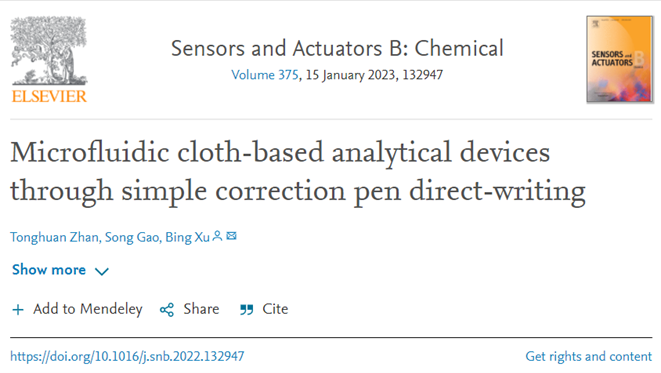 近日,我校机械工程学院许兵老师指导2020级机电工程专业本科生詹童欢和机械设计专业本科生高嵩分别以第一、第二作者身份在国际微流控顶级期刊《Sensors and Actuators B: Chemical》发表题为 “Microfluidic cloth-based analytical devices through simple correction pen direct-writing”的研究论文,我校为唯一通讯单位,许兵副教授为通讯作者。