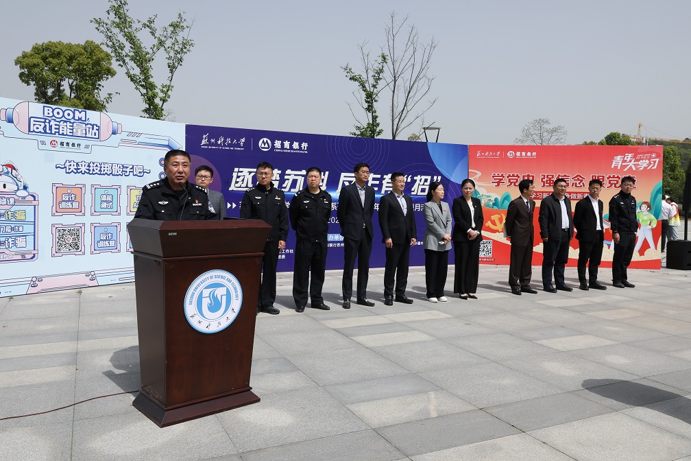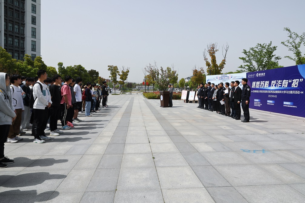 高新区公安分局内保大队长徐峻和招商银行苏州分行零售银行部总经理助理王伟先后致辞,从电信网络诈骗高发态势、不法分子诈骗手段及防范办法,提醒大家增强防骗意识,养成成熟理性的金融消费理念。保卫处处长朱永涛宣布活动启动,希望大学生切实提高辨别能力,保护好自身财产安全,不贪便宜,远离诈骗,为平安校园建设贡献力量。