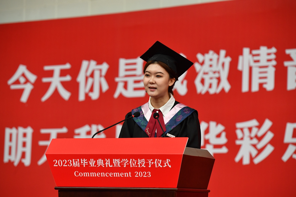 毕业生代表、马克思主义学院政师1912班王浡伊同学发言,感谢母校和老师们的陪伴成长,将铭刻大学四年的温暖记忆,继续奋楫扬帆、不负韶华,勇敢追寻自己的梦想。