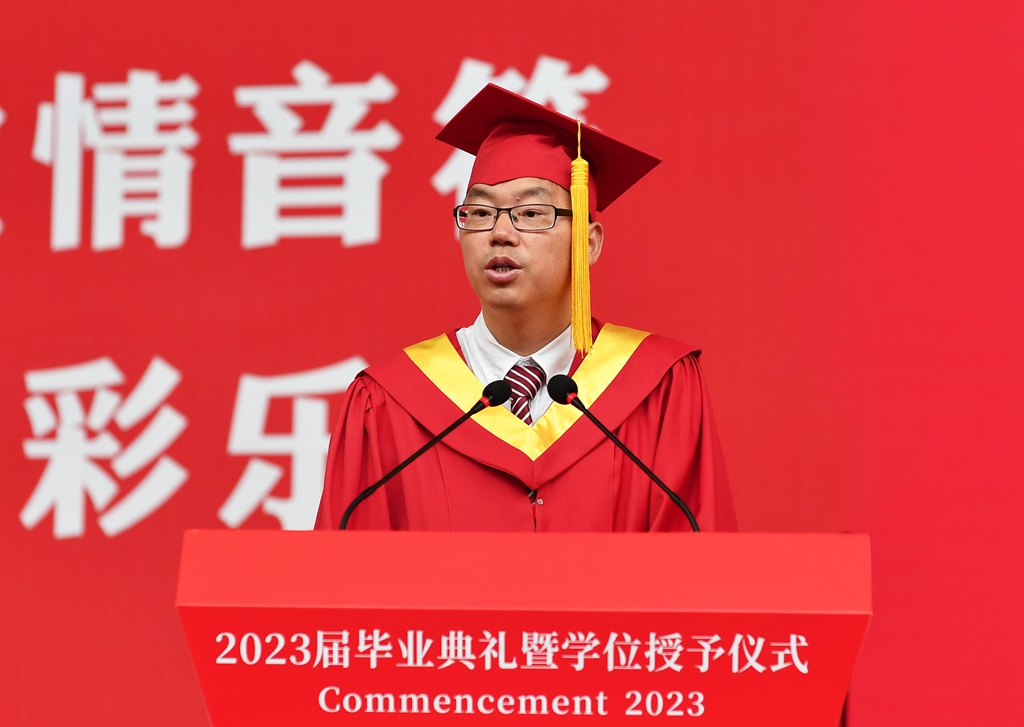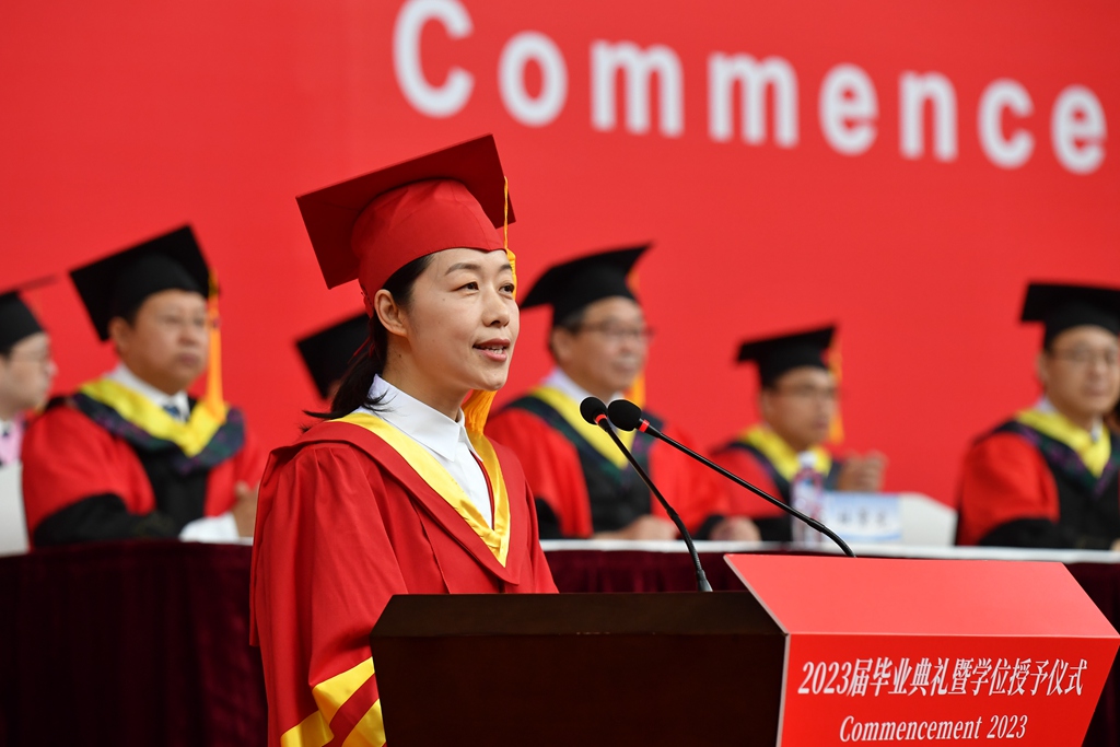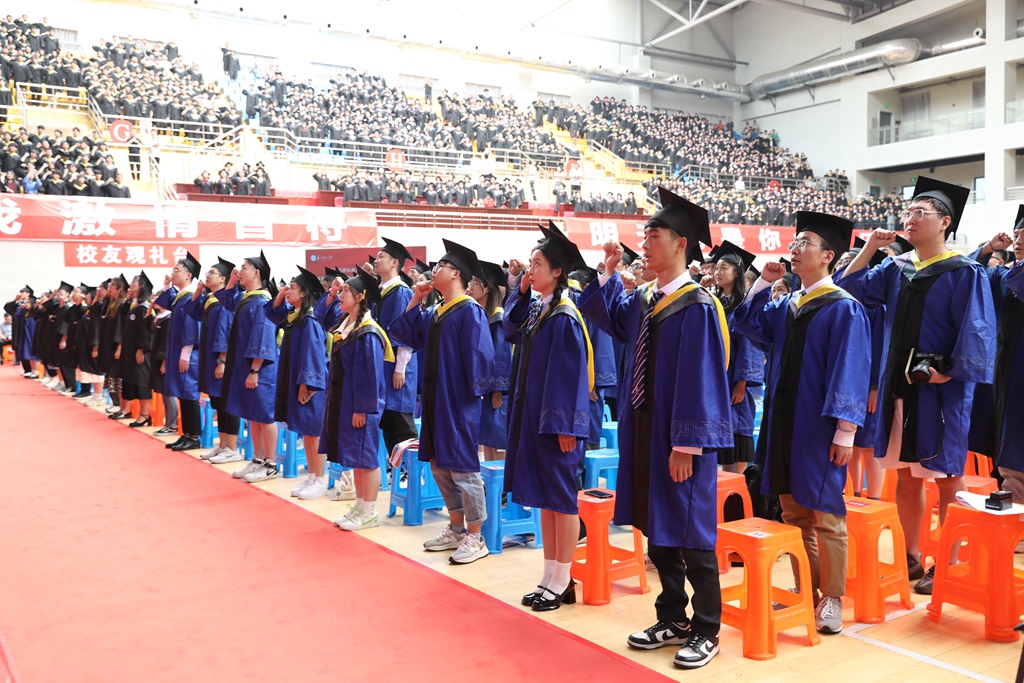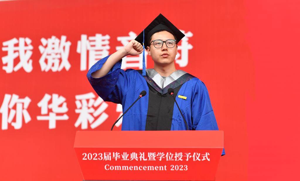 物理科学与技术学院物理学专业研究生姚杨同学带领全体毕业生宣誓:“不忘师长教诲,铭记母校嘱托,传承‘致远至恒、务学悟真’的校训精神,肩负时代使命,勇担社会责任,毕生追求真理,争当创新先锋……”