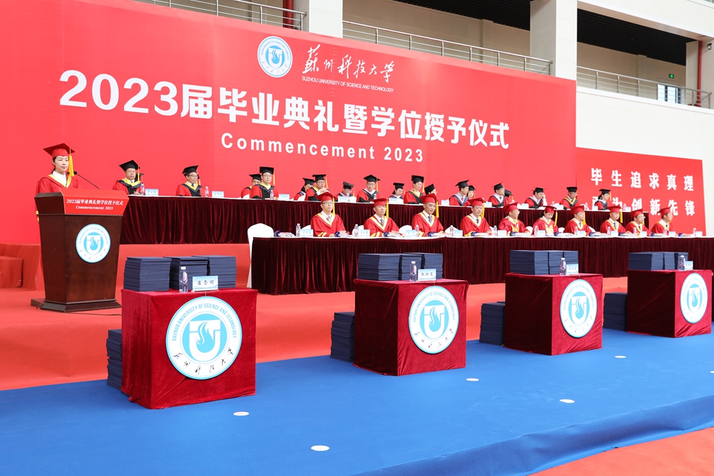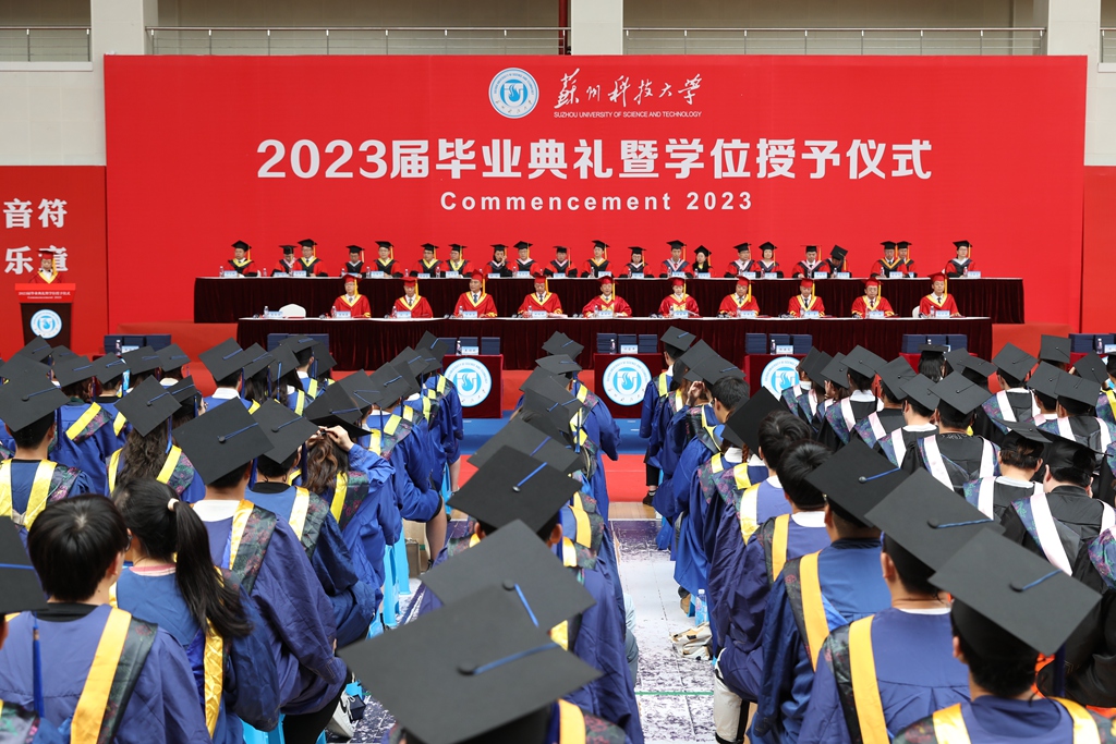 仲夏时节,万物并秀;拨穗正冠,整装待发。6月10日上午,我校在石湖校区体育馆举行2023届学生毕业典礼暨学位授予仪式,见证毕业生圆满完成学业,开启璀璨人生新征程。全体校领导,校学位评定委员会成员,各教学单位及相关职能部门负责人、5236名2023届本硕毕业生,17名来自祖国各地的优秀校友代表、因疫情原因未能参加毕业典礼的100名2022届毕业生等参加典礼。毕业典礼由校党委常委、副校长崔雪丽主持。