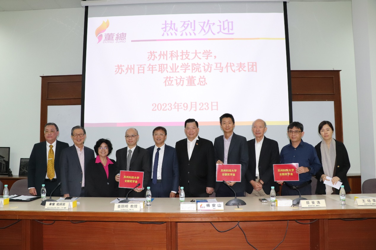 在马来西亚华校校董联合会总会(董总)的组织下,留学苏科大奖学金启动仪式举行。苏州百年职业学院创办人、马来西亚拿督赖炳荣先生,董总领导、当地华商代表,马来西亚华校三所独立中学代表及我校代表团、苏州百年职业学院代表出席仪式。2024年,马来西亚华校校董联合会总会首批将设立25个全额奖学金,资助马来西亚华校独立中学高中毕业生赴苏科大攻读本科学士学位。姜朋明表示,期待马来西亚华校学子早日来苏,学校将全力做好教学安排和日常保障工作,帮助他们在我校学有所成,度过美好而难忘的留学生活。