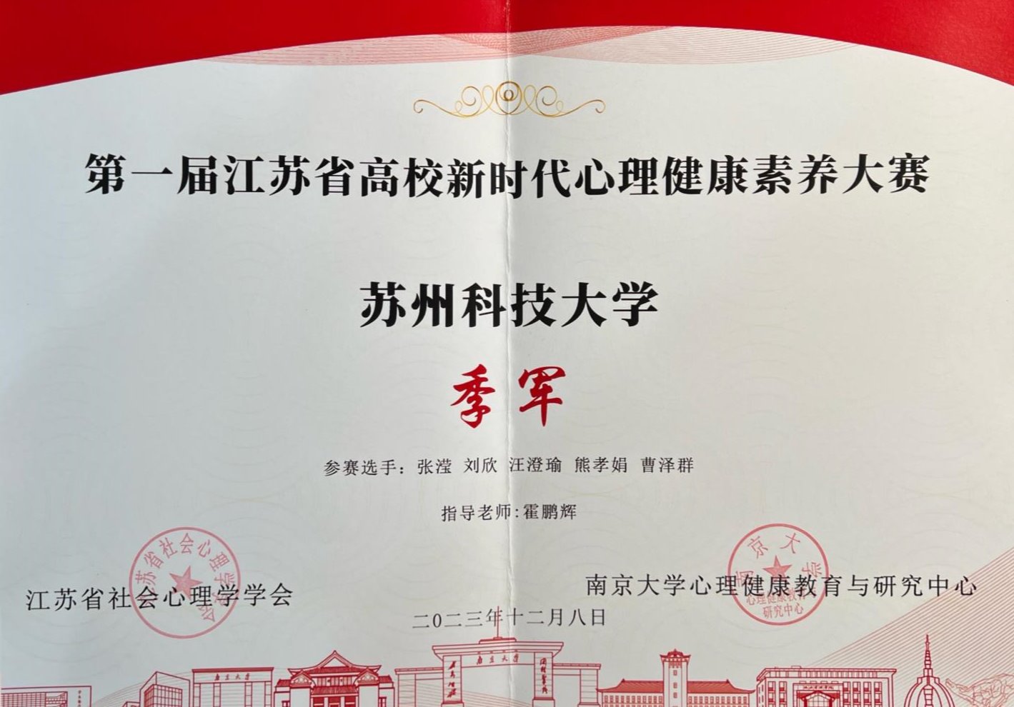 据悉,本次大赛由江苏省社会心理学学会和南京大学心理健康教育与研究中心主办,共有104所省内高校参赛。大赛分为心理健康知识竞赛、心理健康主题班会评比、心理健康特色活动评比、心理健康会谈能力竞赛等四个赛道。我校参加心理健康知识竞赛环节的评比。