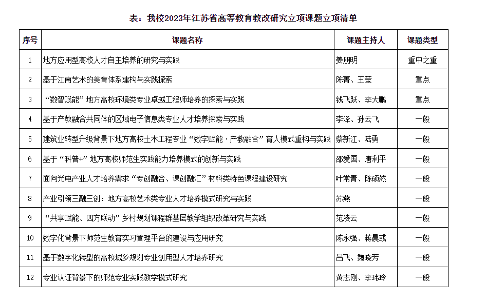 近日,江苏省高等教育学会发布了《关于公布2023年江苏省高等教育教改研究立项课题评选结果的通知》(苏高教会〔2023〕38号),我校获批12项立项,其中重中之重1项,重点课题2项,一般课题9项。