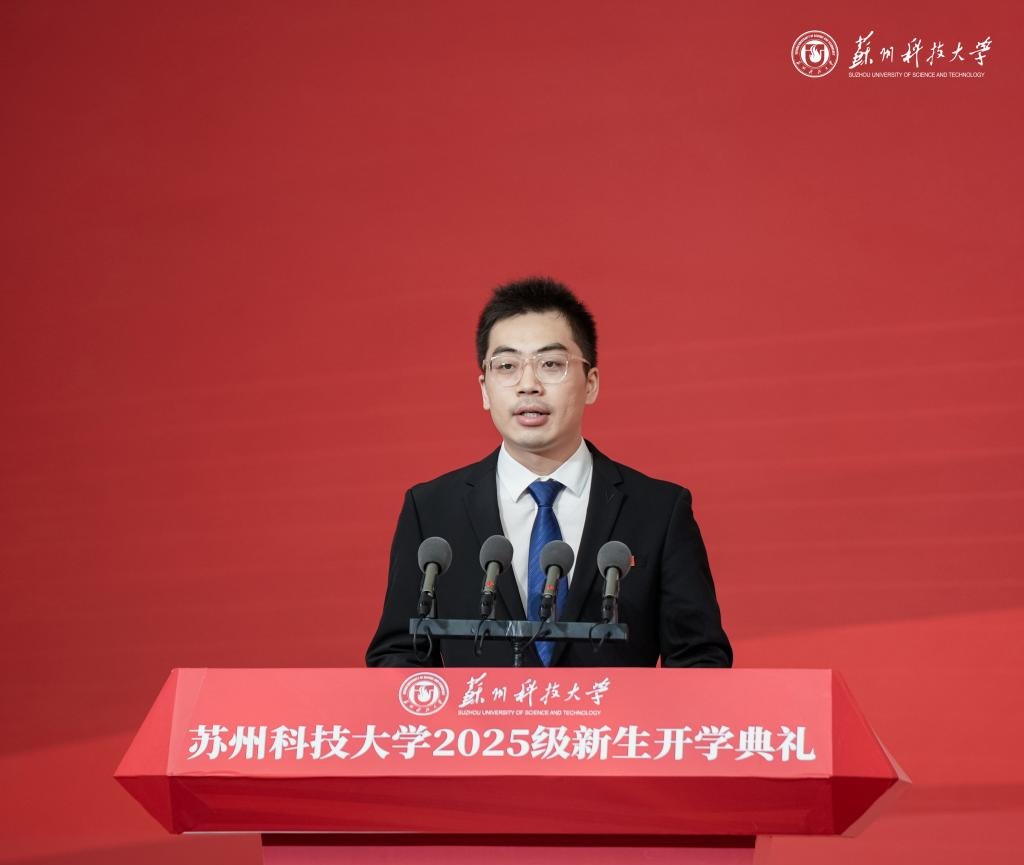 来自敬文书院、社会发展与公共管理学院社会工作专业的华若菡同学代表本科新生发言,表示将及时调整心态,适应大学生活;夯实理论基础,拓宽知识视野;坚持学以致用,展现青年担当。中国科协青年人才托举工程、江苏省优青项目获得者、物理科学与技术学院李阳老师分享了“理想”“踏实”“情怀”三个关键词,希望同学们心怀理想、踏实前行、坚守情怀,挖掘好苏科大这一“宝藏”,书写属于自己的人生篇章。