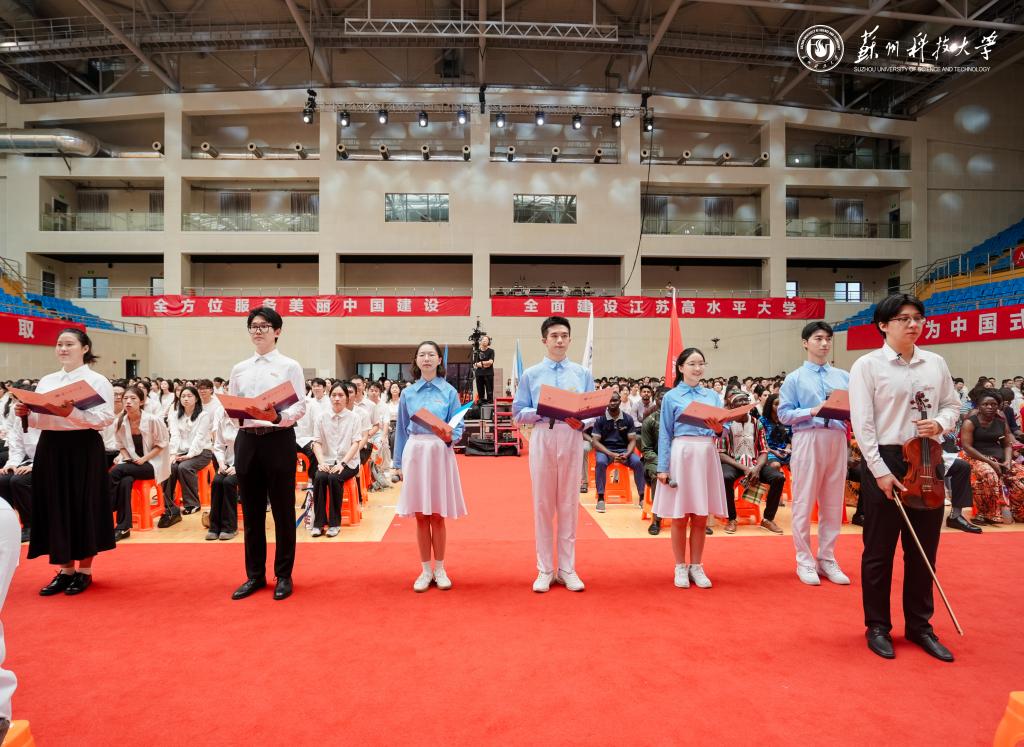 研究生开学典礼前,学生代表带来朗诵《以青春之名赴苏科大之约》,表达了青年学子将个人理想融入学校发展、国家建设,立志为建设美丽中国贡献青春力量的使命担当与坚定信念。1436名硕士研究生,来自22个国家的109名国际研究生和首批25名博士研究生参加典礼。
