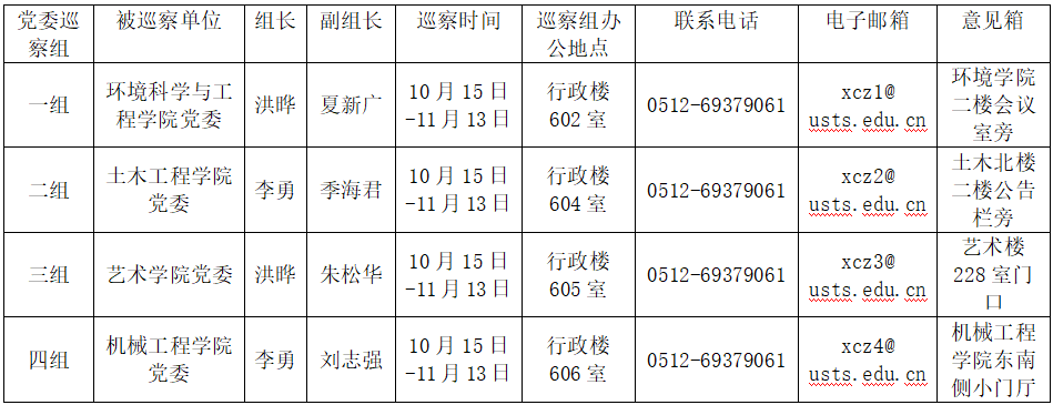 各巡察组于10月15日-11月13日进行集中巡察。巡察期间,巡察组在行政楼六楼集中办公,开设联系电话和电子邮箱,并在被巡察单位设置巡察工作意见箱,主要受理反映被巡察党组织党政领导班子及其成员和下一级主要负责人问题的来信、来访,其他不属于巡察受理范围的问题,将按规定由被巡察单位和有关部门认真处理。