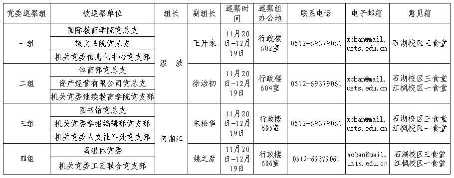 各巡察组于11月20日至12月19日进行集中巡察。巡察期间,巡察组在行政楼六楼集中办公,开设联系电话和电子邮箱,并在石湖校区三食堂、江枫校区一食堂设置巡察工作意见箱,主要受理反映被巡察党组织党政领导班子及其成员和下一级主要负责人问题的来信、来访,其他不属于巡察受理范围的问题,将按规定由被巡察单位和有关部门认真处理。