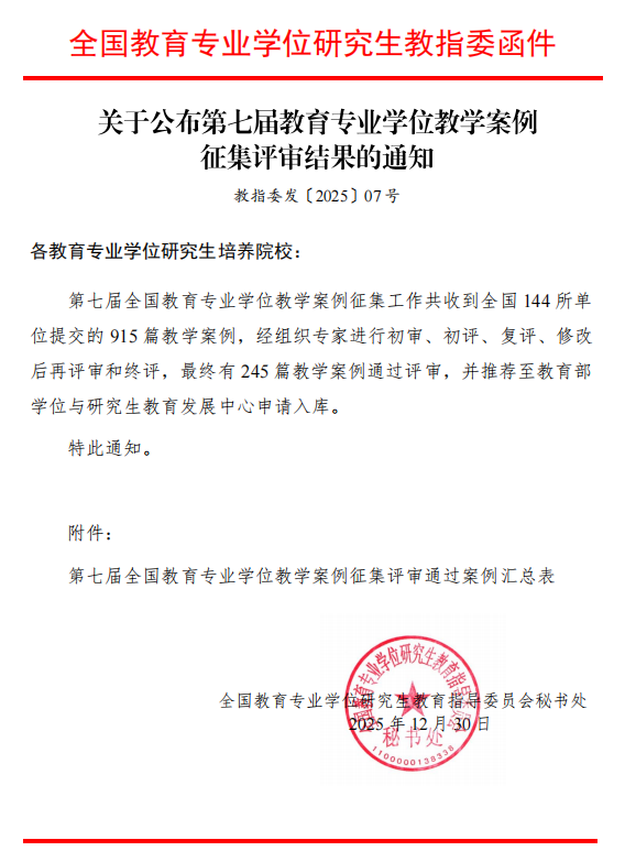 全国教育专业学位教学案例征集评选是我国教育专业学位领域层级最高、评审最严格的教学案例评选活动之一。本次案例征集共收到来自全国144所院校的915篇教学案例,经多轮评审,最终245篇案例入选教育部学位与研究生教育发展中心案例库。
