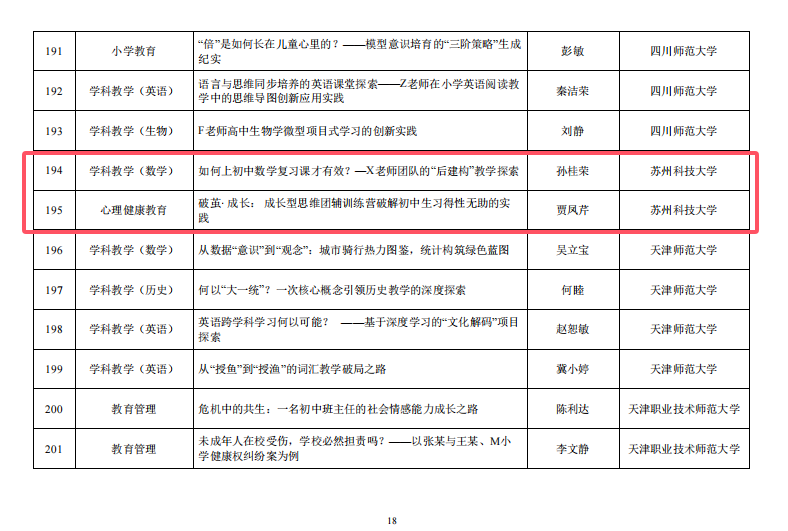 近日,全国教育专业学位研究生教育指导委员会公布了第七届全国教育专业学位教学案例征集评审结果。我校数学科学学院副教授孙桂荣主持撰写的《如何上初中数学复习课才有效?——X老师团队的“后建构”教学探索》和教育学院副教授贾凤芹主持撰写的《破茧·成长:成长型思维团辅训练营破解初中生习得性无助的实践》成功入选。