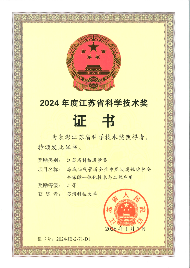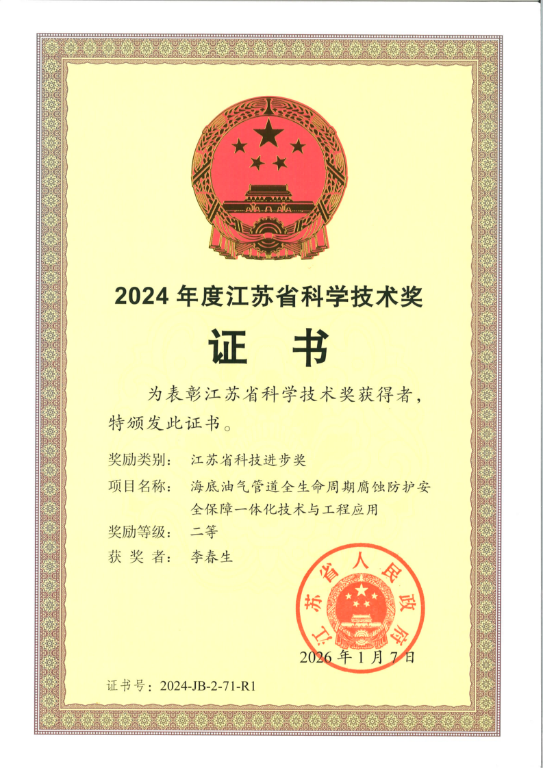 近日,江苏省人民政府发布《关于2024年度江苏省科学技术奖励的决定》(苏政发〔2026〕2号),我校化学与生命科学学院教授李春生牵头完成的成果“海底油气管道全生命周期腐蚀防护安全保障一体化技术与工程应用”荣获省科技进步奖二等奖。
