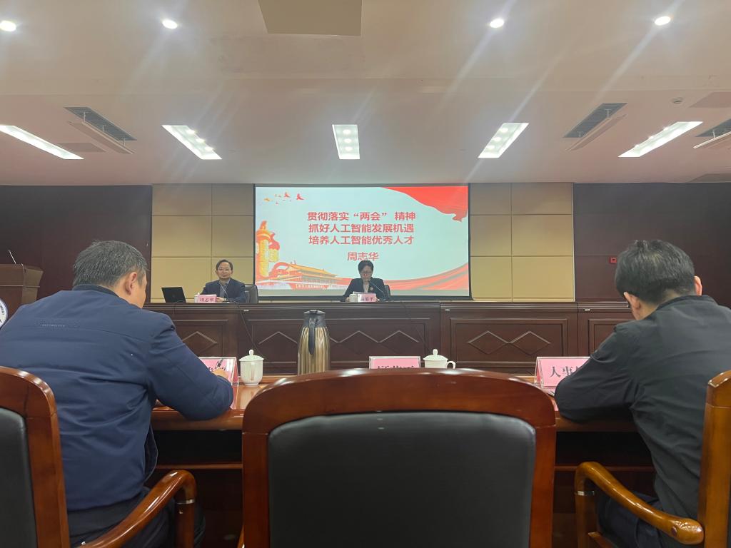 3月28日下午,中国科学院院士、南京大学副校长周志华应邀来我校作题为《贯彻落实两会精神 抓好人工智能发展机遇 培养人工智能优秀人才》的专题报告。报告会由校长顾菊平主持,相关职能部门和学院负责人、师生代表等参加报告会。