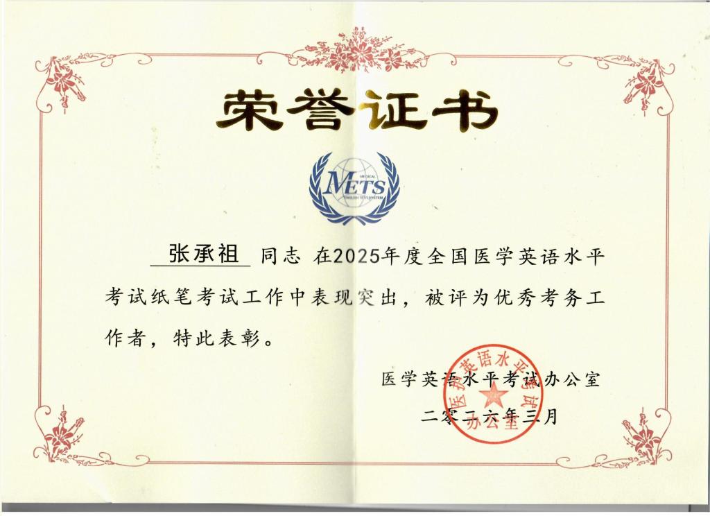 3月26日-3月29日,全国医学英语水平考试2026年上半年工作会议在江西上饶召开,我校荣获“2025年度全国医学英语水平考试纸笔考试优秀考点”,张承祖同志获评“2025年度优秀考务工作者”。