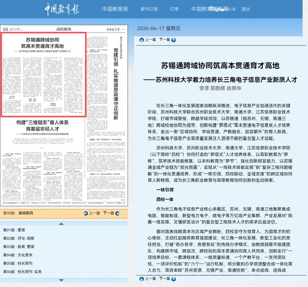 《中国教育报》:苏锡通跨域协同 筑高本贯通育才高地——苏州科技大学着力培养长三角电子信息产业新质人才